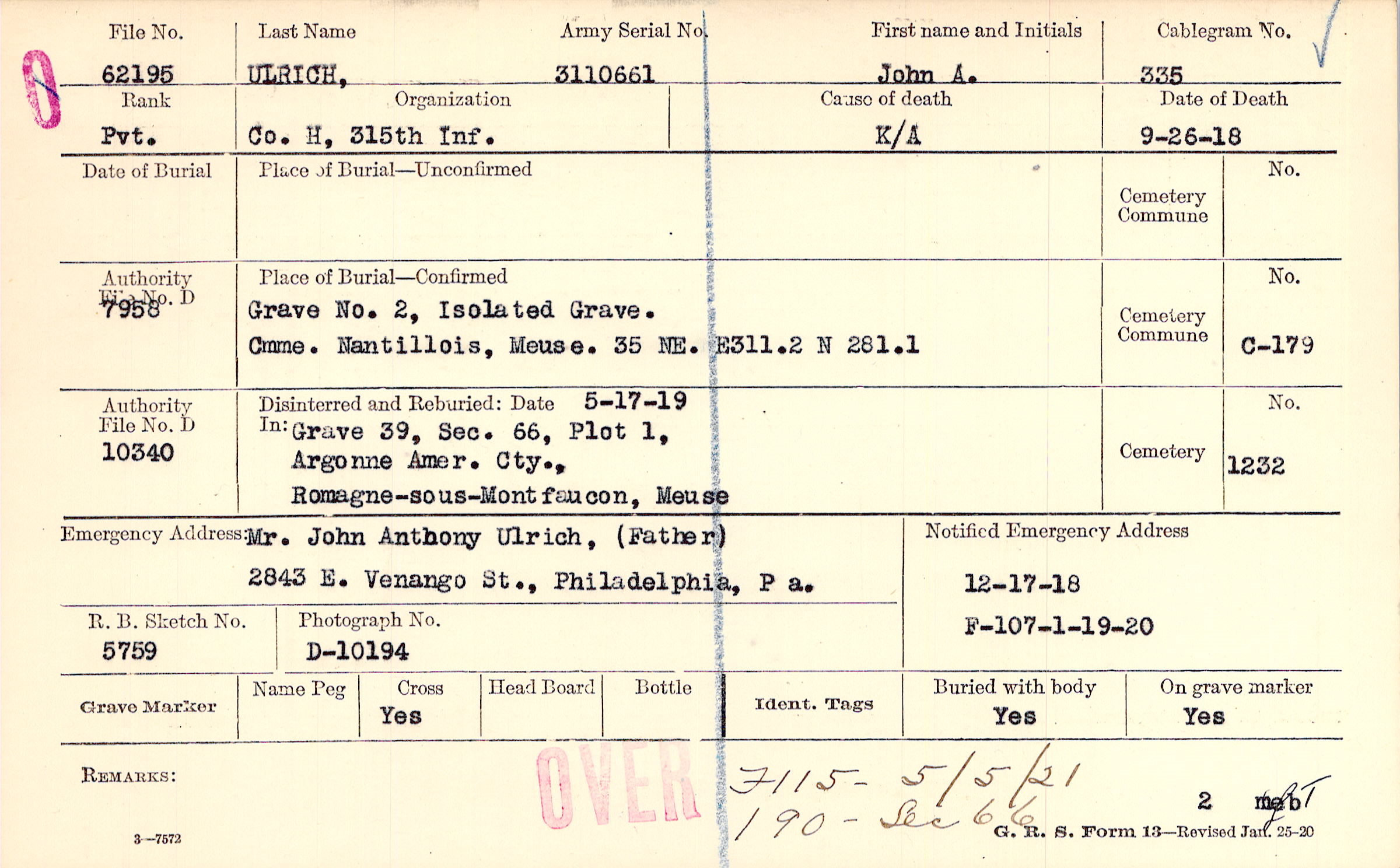 Mr. John Anthony Ulrich, (Father), 2843 E. Vanango St., Philadelphia, P a.
