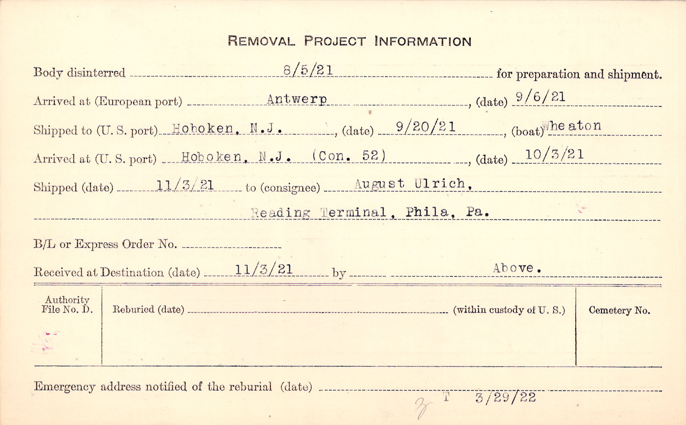 Body disinterred 8/5/1921 for preparation and shipment.