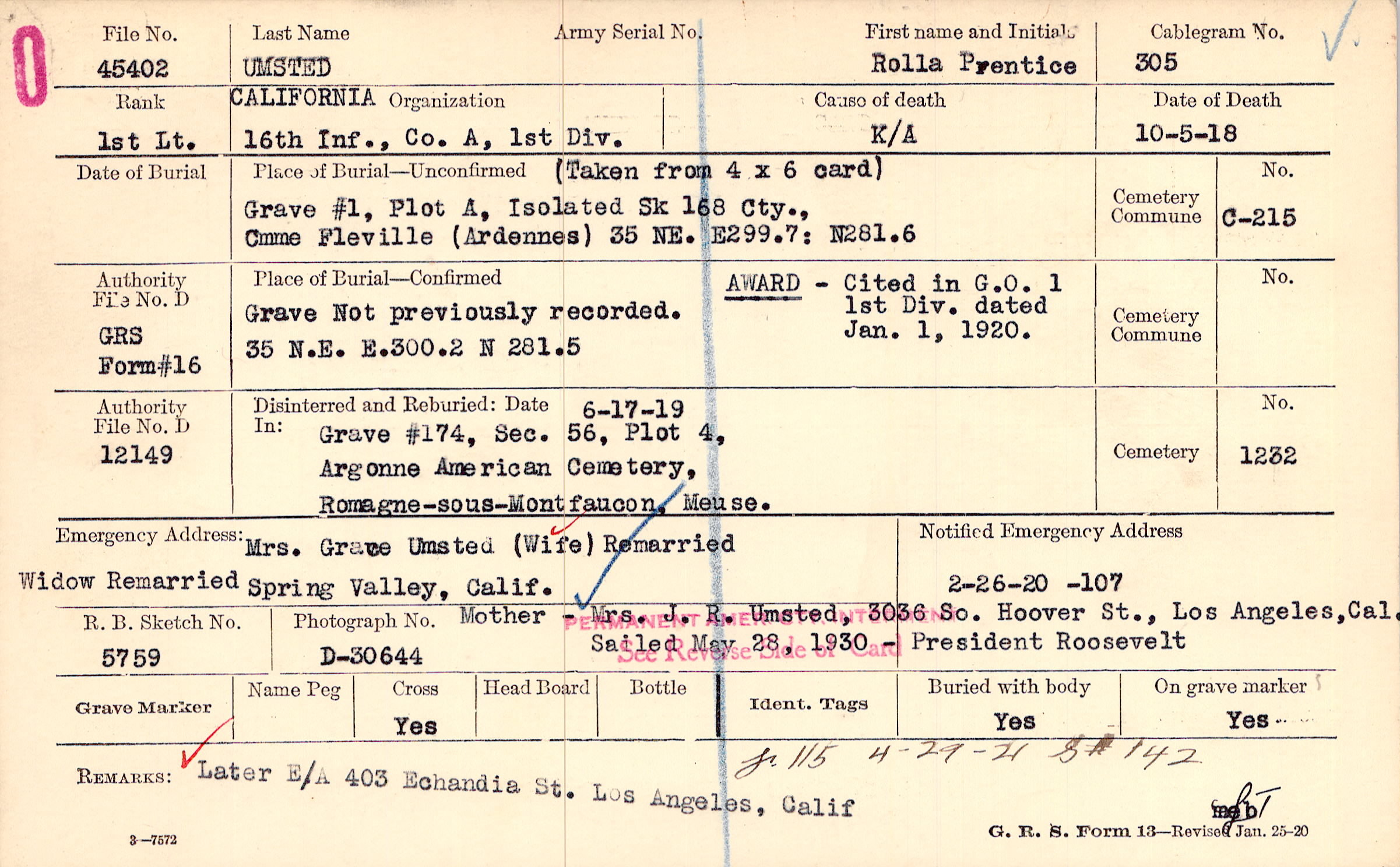 Mrs. Grace Umsted (Wife) Remarried, Spring Valley, Calif., Remarried Widow Remarried Mother - Mrs. J. R. Umsted, 3036 So. Hoover St., Lost Angeles, Cal. Sailed May 28, 1930 - President Rooselevelt