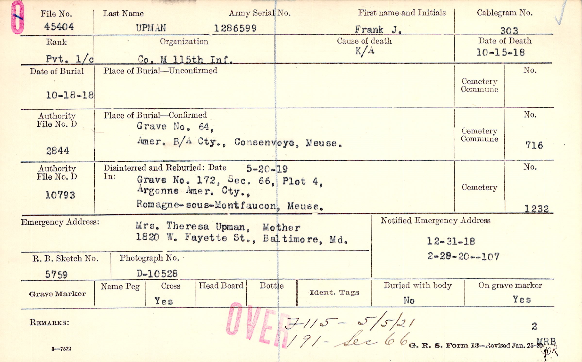 Grave 64, Amer. B/A Cty., Consenvoye, Meuse.