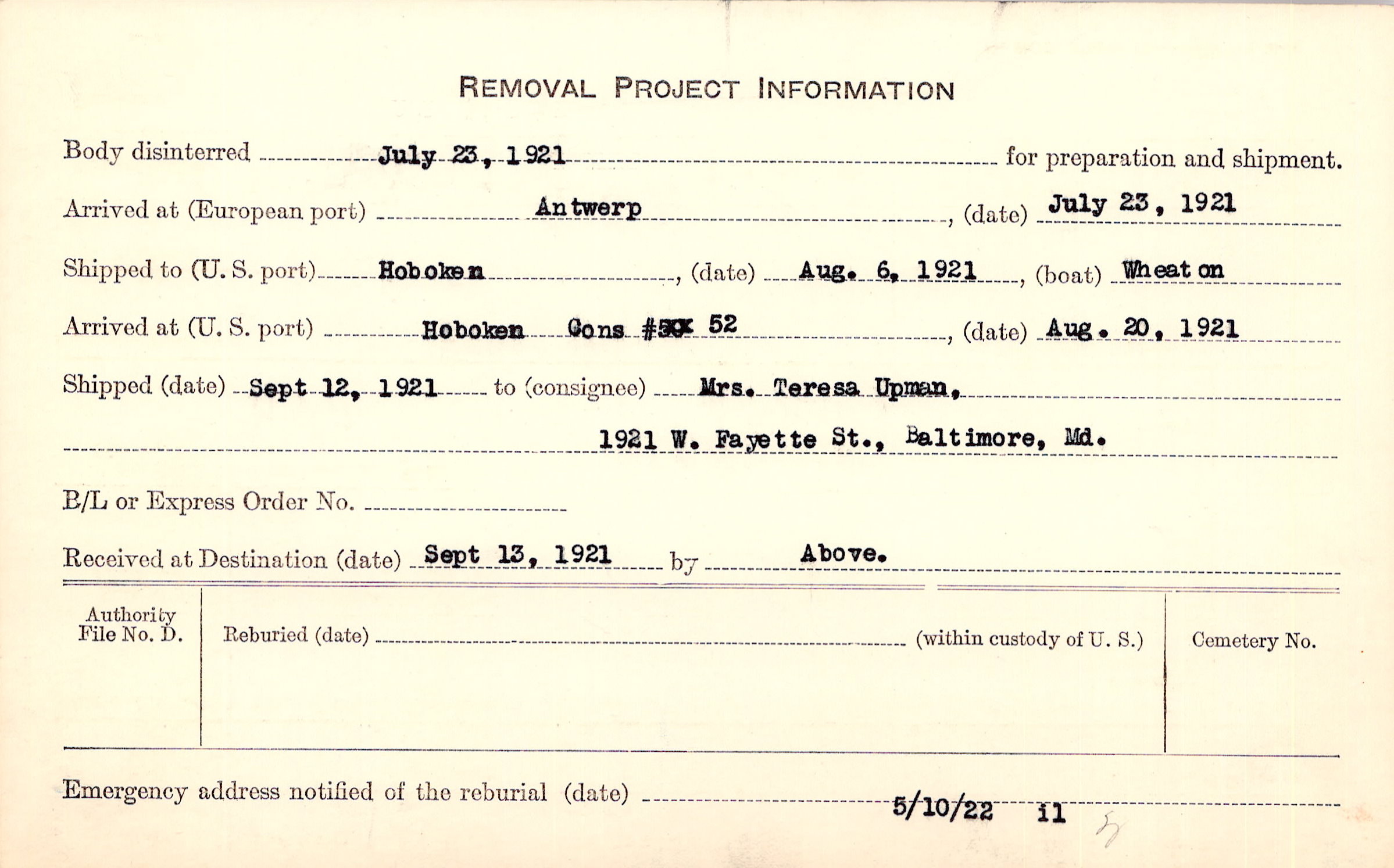 Body disinterred 7/23/1921 for preparation and shipment.