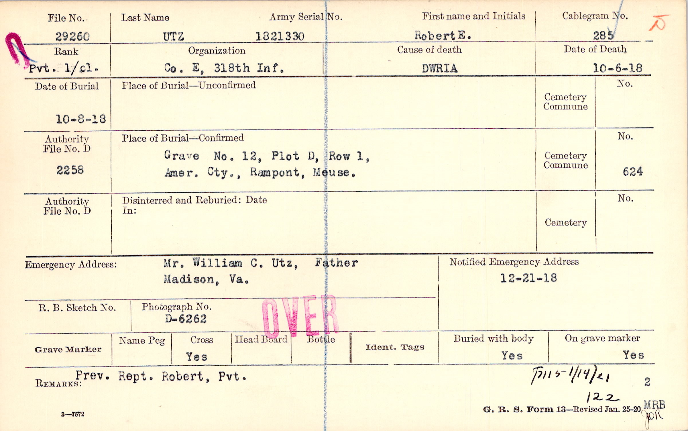 Grave 12, Plot D, Row 1, Amer. Cty., Rampont, Meuse.