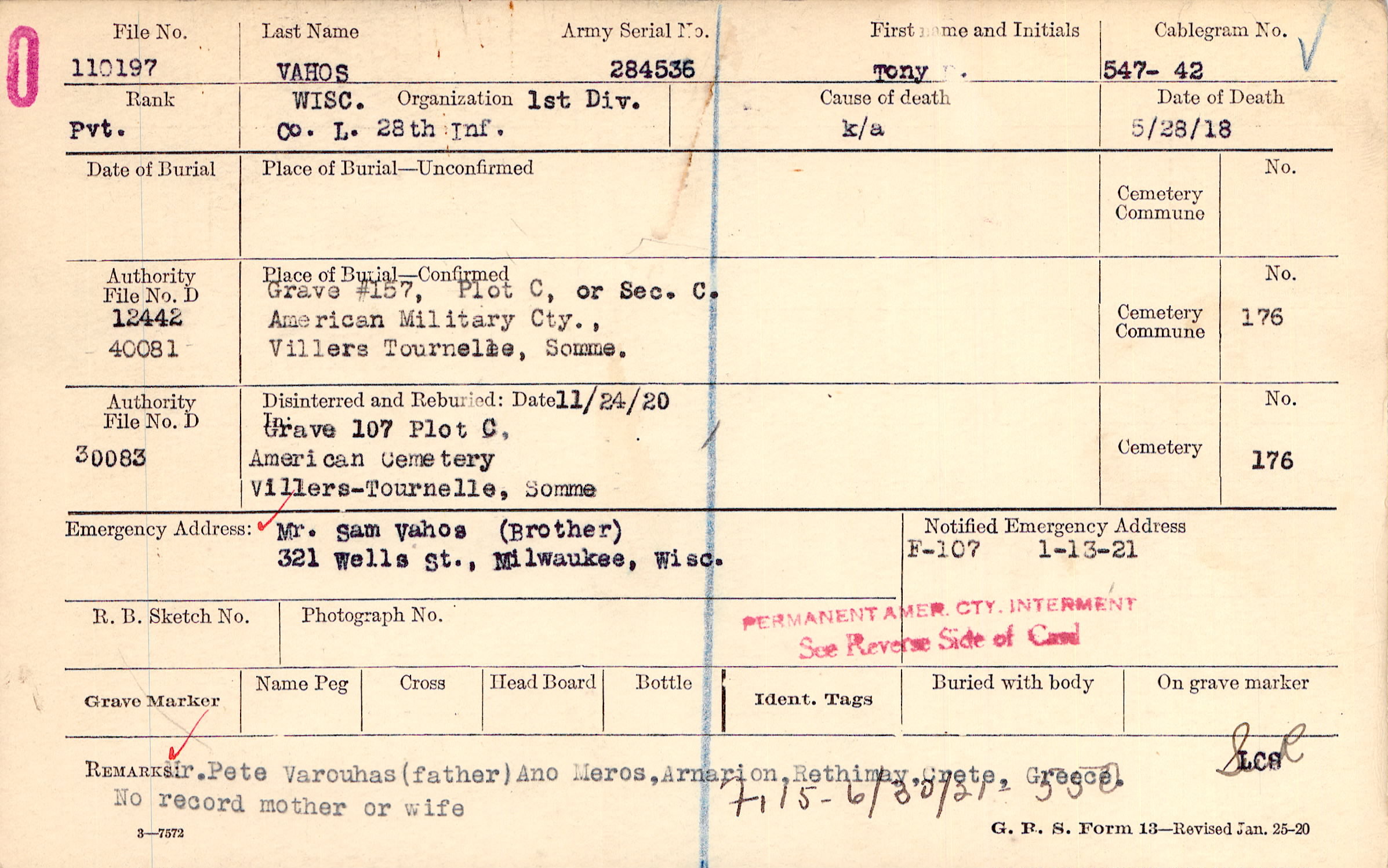Mr. Pete Varouhas (father) Ano Meros, Arnarion, Rethimay, Crete, Greece. No record of mother or wife, F115 - 6/30/21 - 550