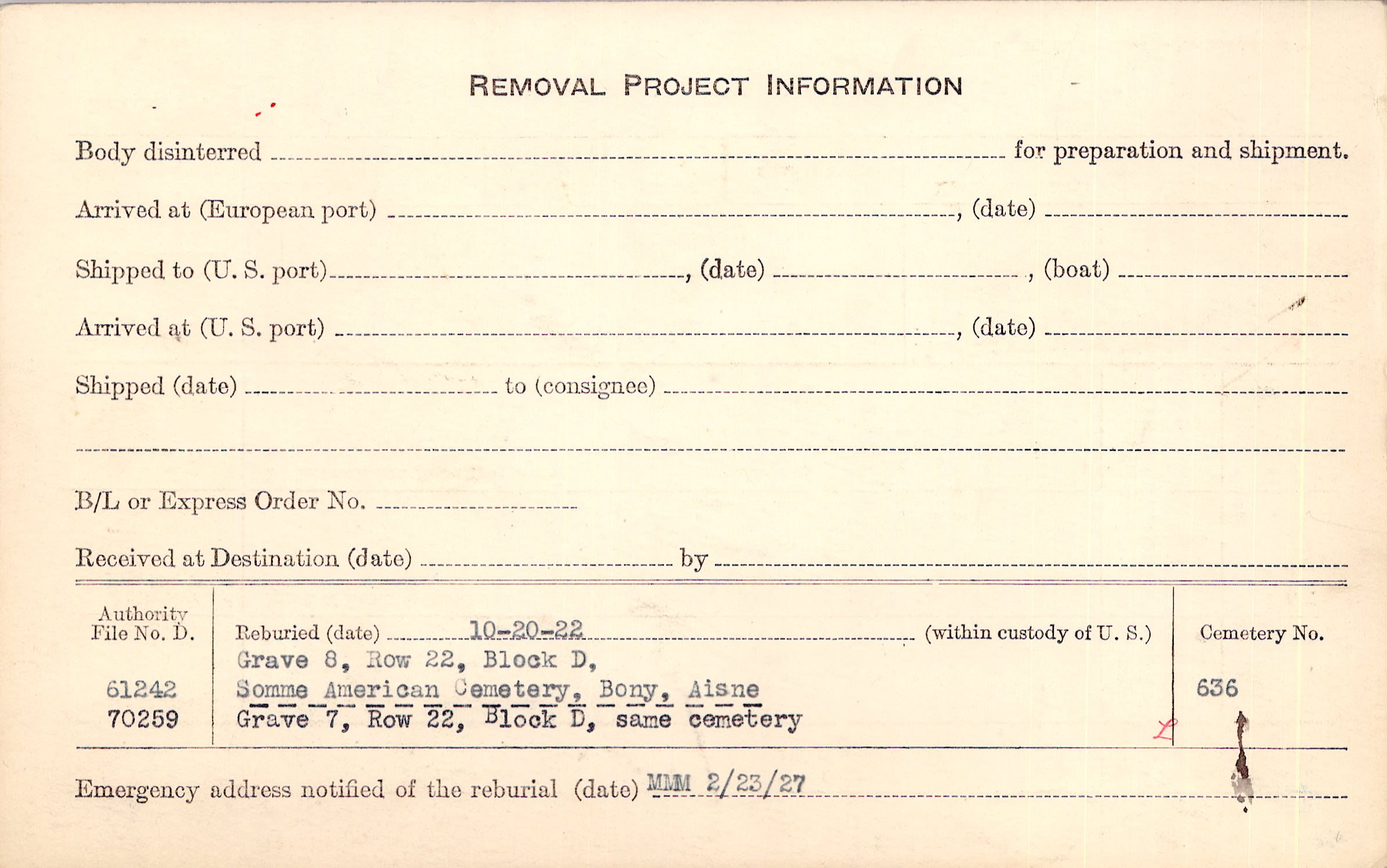Grave 107, Plot C, American Cemetery, Villers-Tournelle, Somme