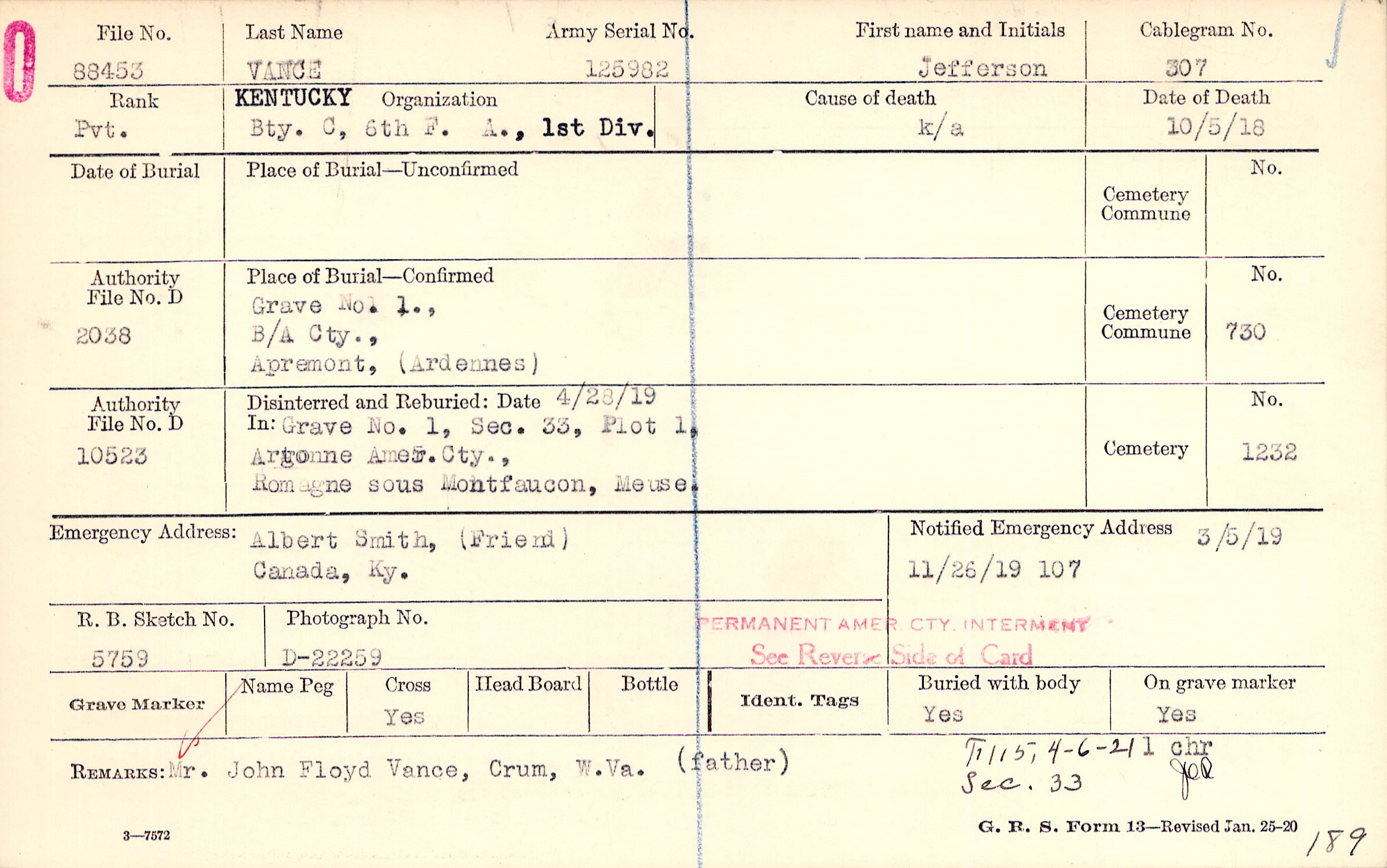 Mr. John Floyd Vance, Crum, W. Va. (father), F115, 4-6-21 Sec. 33