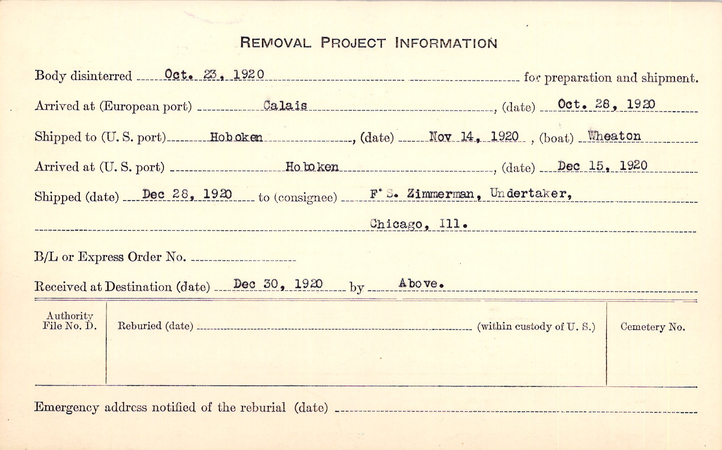 Body disinterred 10/23/1920 for preparation and shipment.