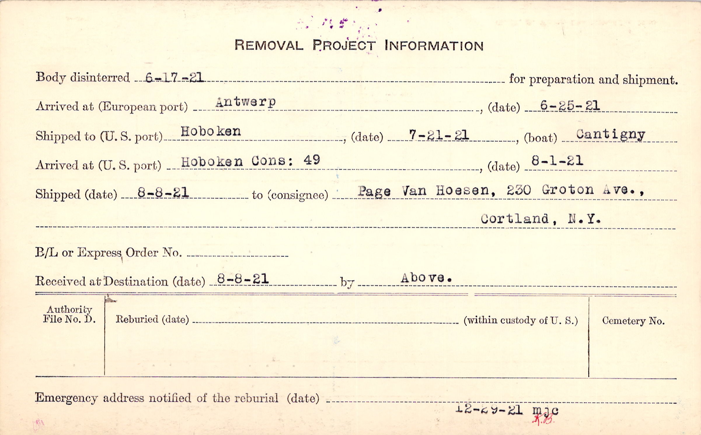 Body disinterred 6/17/1921 for preparation and shipment.