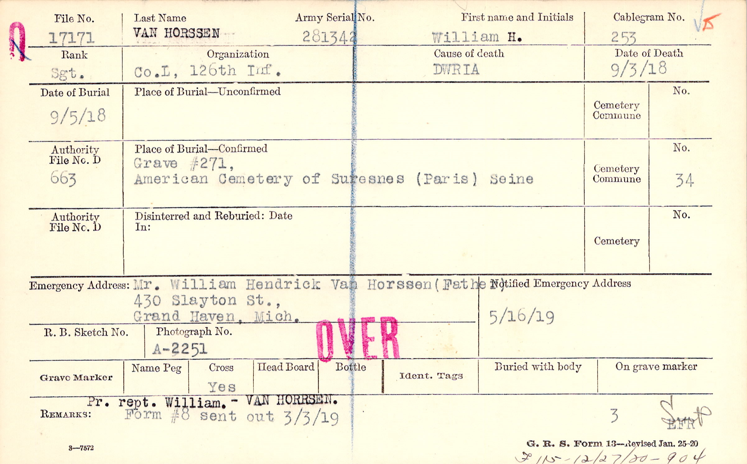 Mr. William Hendrick Van Horssen (Father), 430 Slayton St., Grand Haven, Mich.