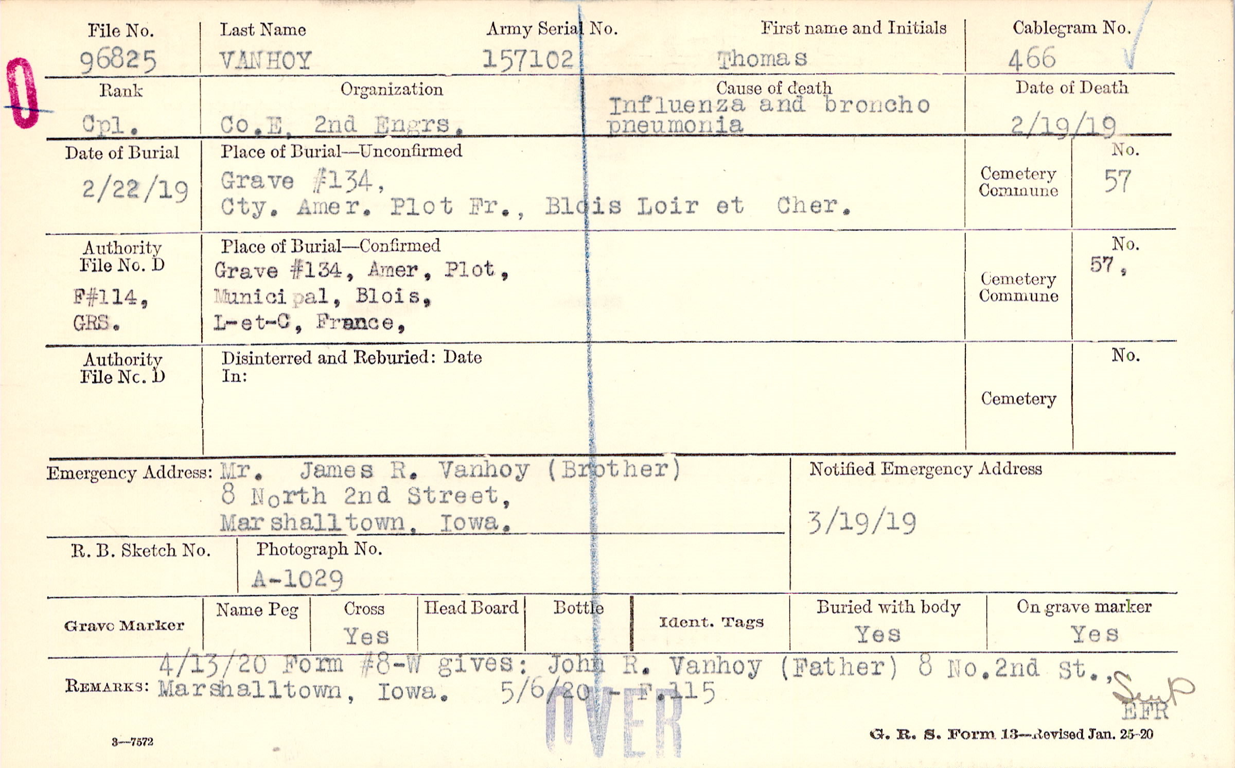 John R. Vanhoy (Father) 8 No. 2nd St., Marshalltown, Iowa., 4/13/20 Form #8-W gives: John R. Vanhoy (Father) 8 No.2nd St., Marshalltown, Iowa., 5/6/20 - F.115