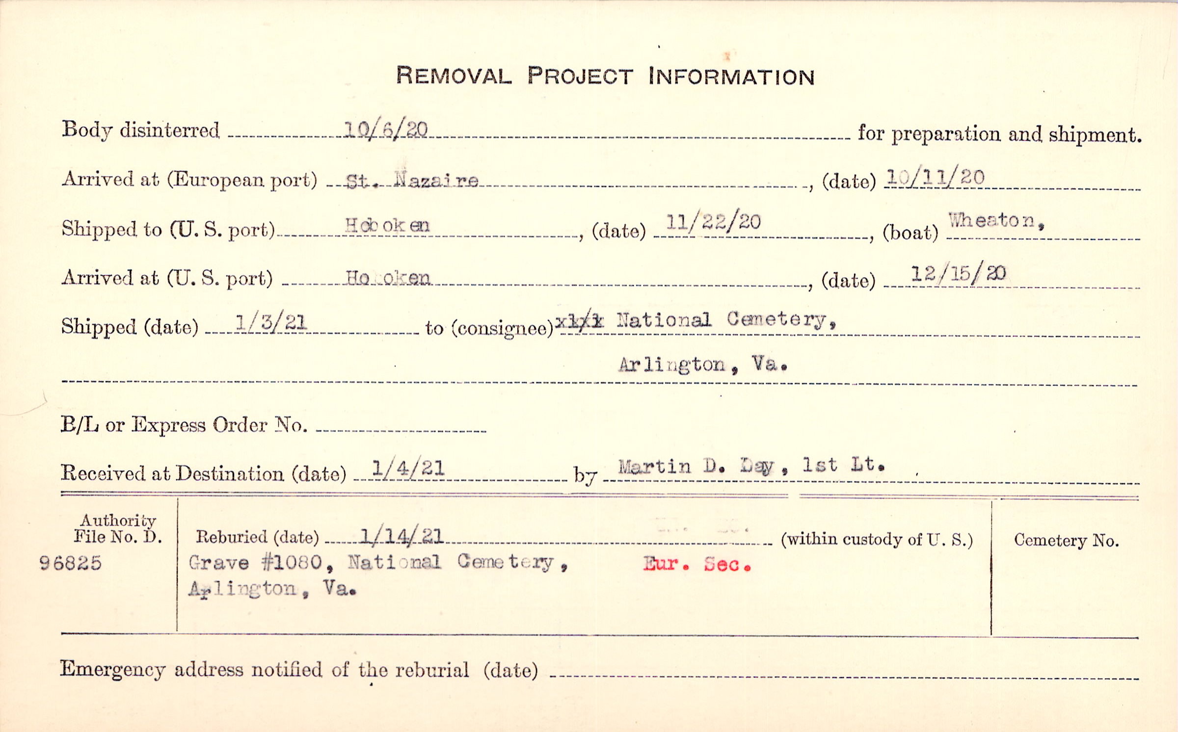 Body disinterred 10/6/1920 for preparation and shipment.
