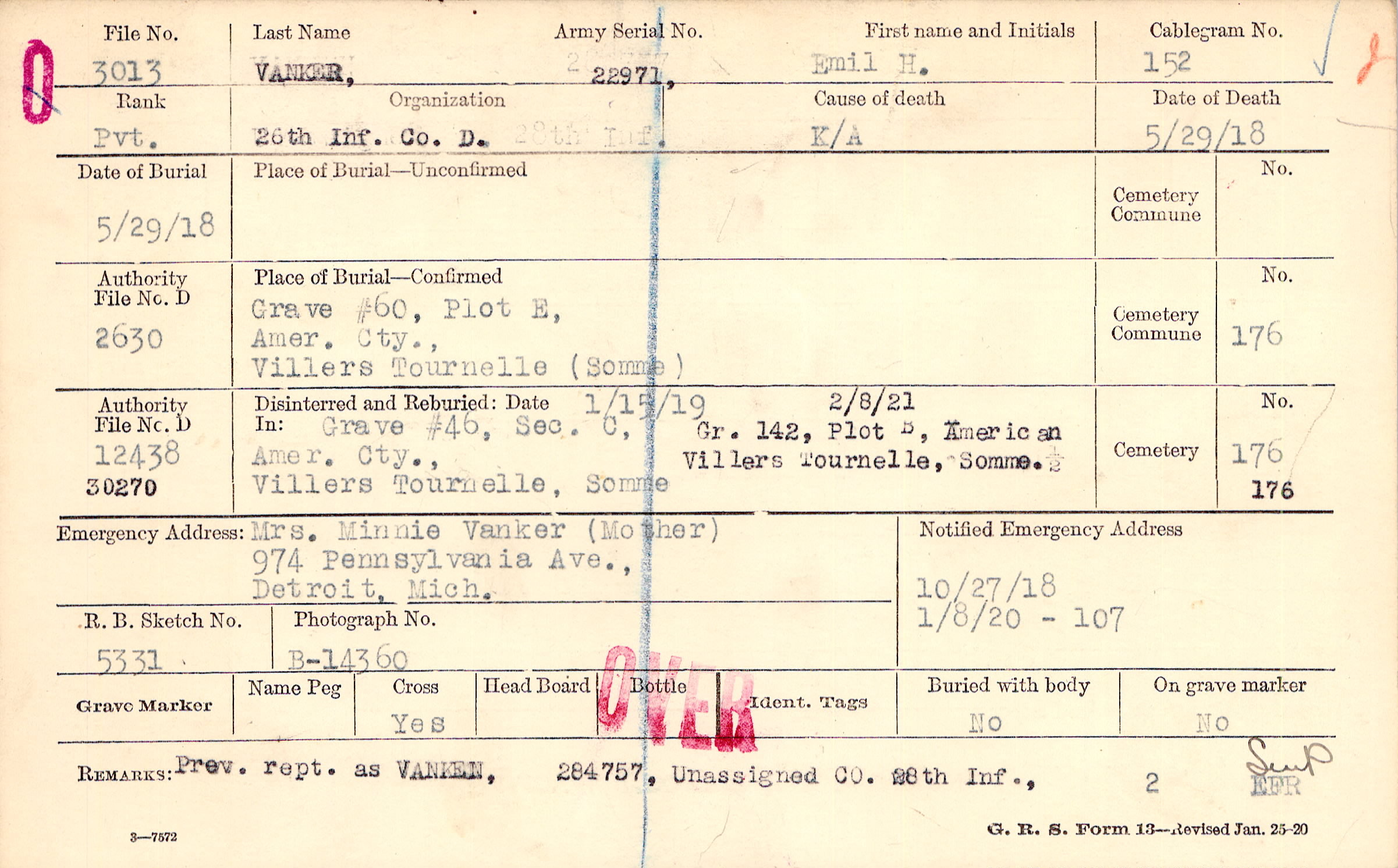 Mrs. Minnie Vanker (Mother), 974 Pennsylvania Ave. , Detroit, Mich.