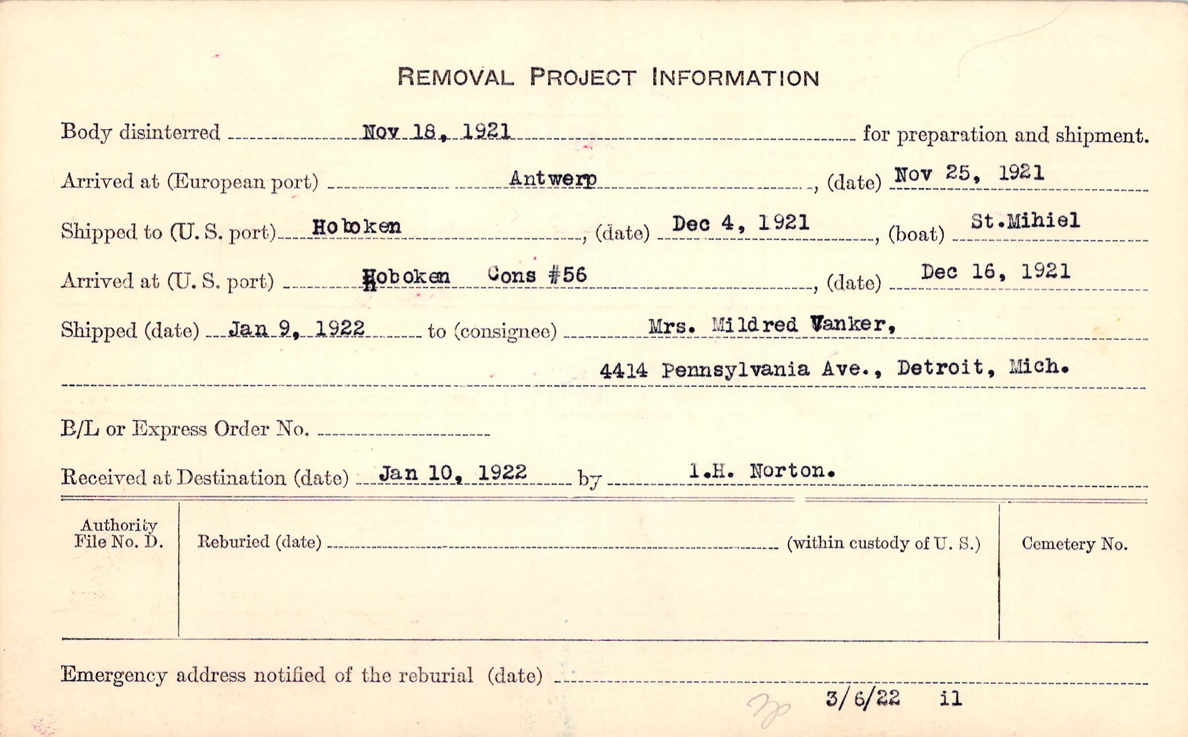 Body disinterred 11/18/1921 for preparation and shipment.