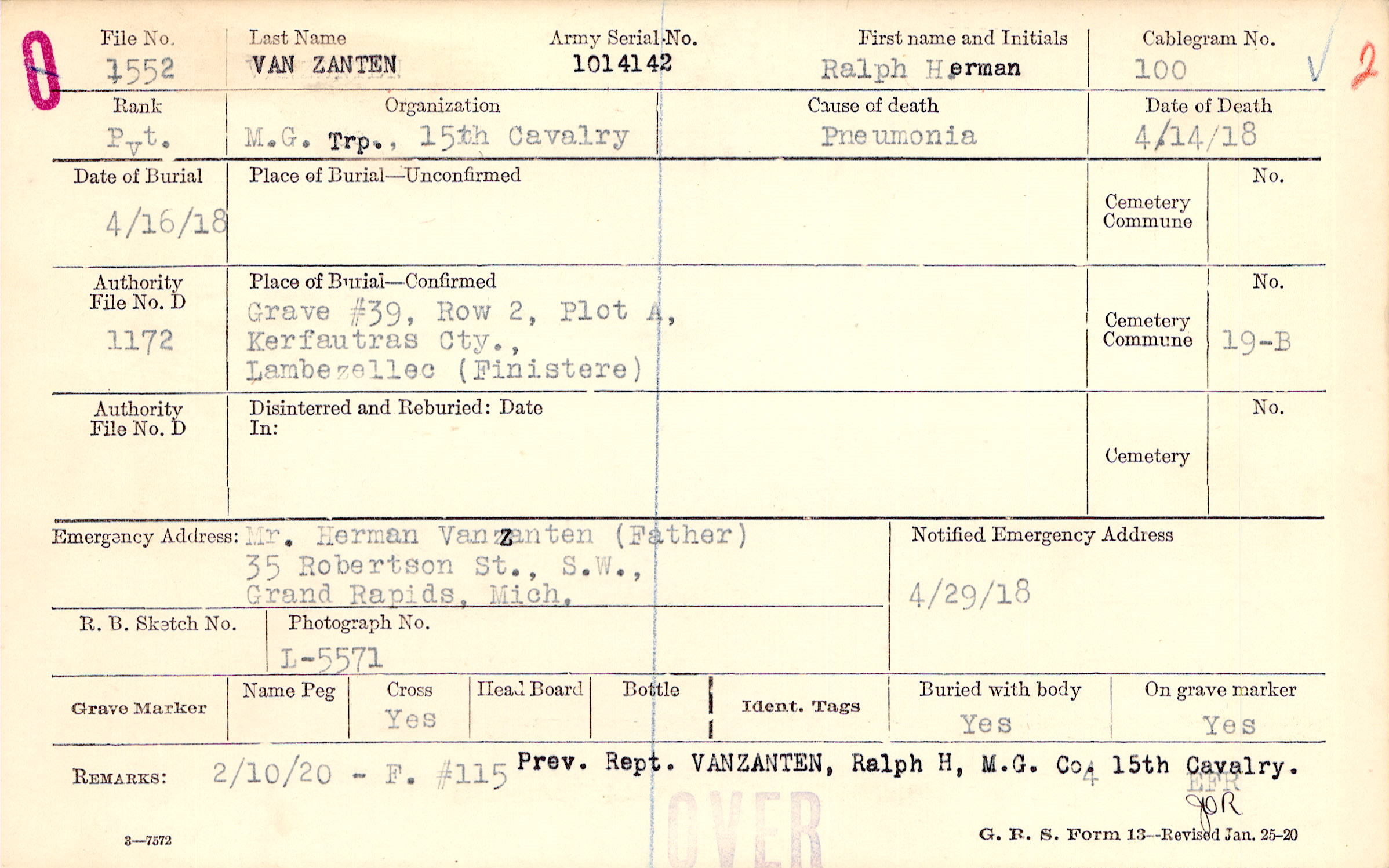 Prev. Rept. VANZANTEN, Ralph H, M.G. Co. 15th Cavalry.