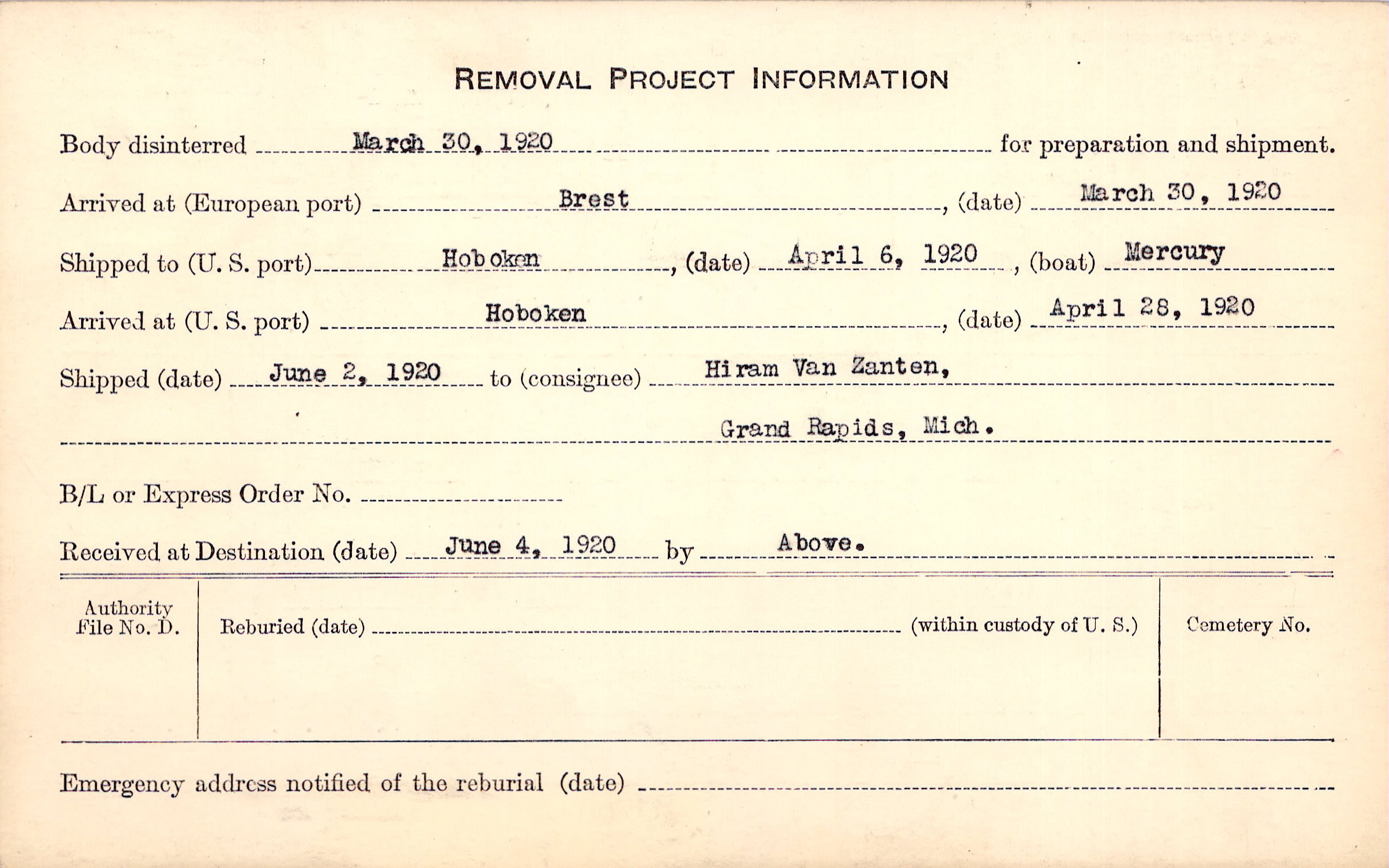 Body disinterred 3/30/1920 for preparation and shipment.