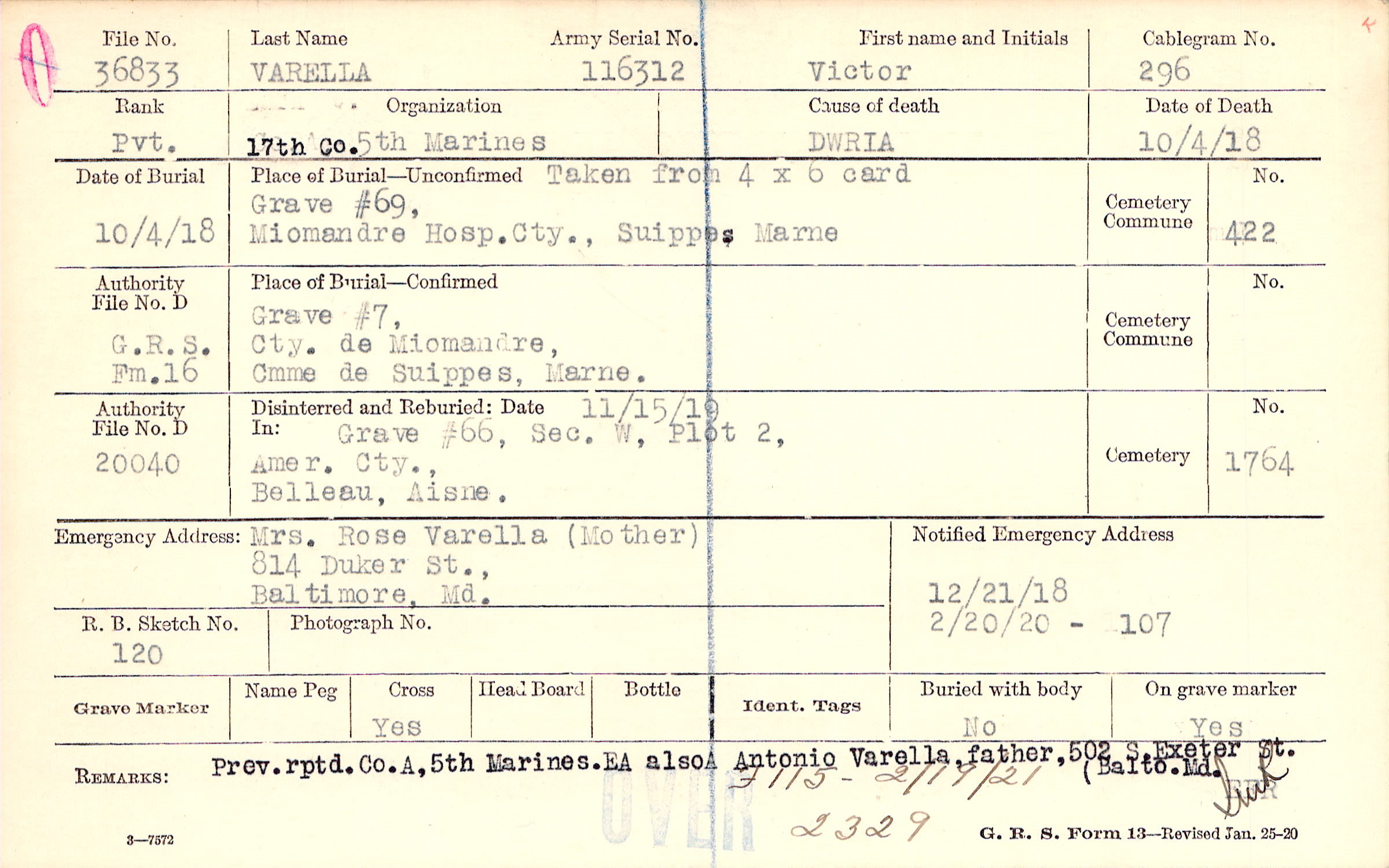 Prev. rptd. Co. A, 5th Marines. EA also Antonio Varella, father, 502 S. Exeter St. (Balto. Md.), F115 - 2/19/21 2329