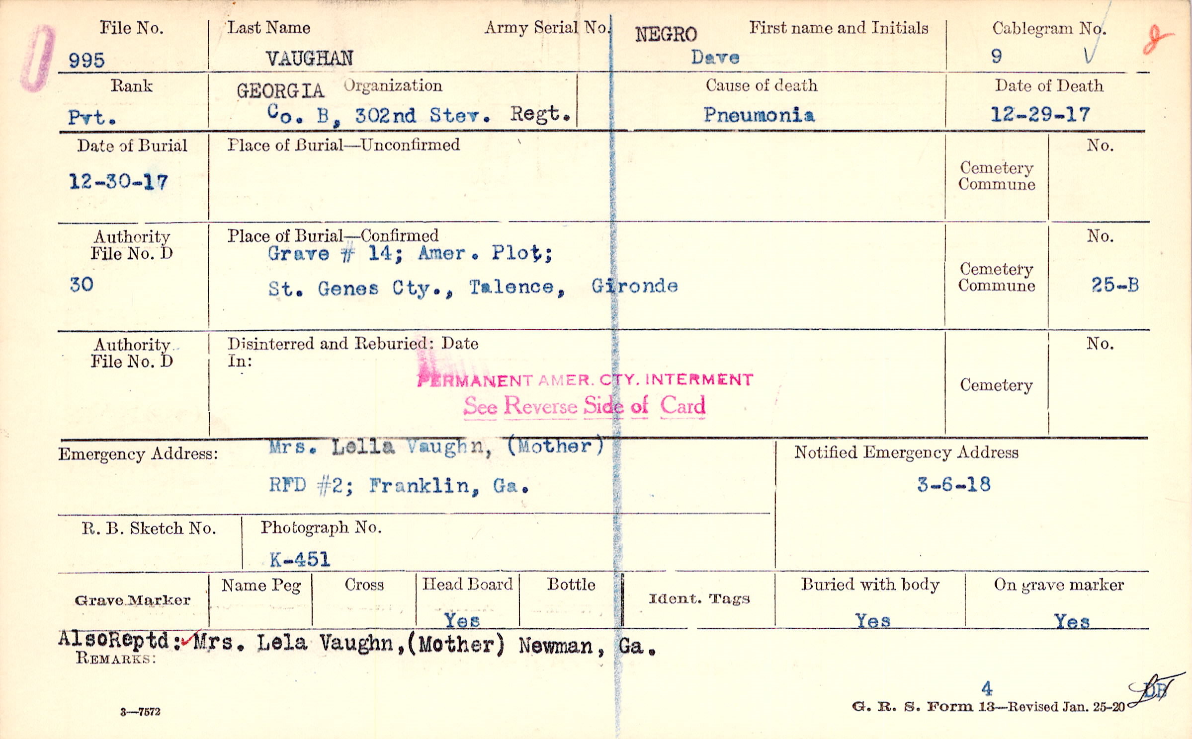 Also Reptd: Mrs. Lela Vaughn, (Mother) Newman, Ga.