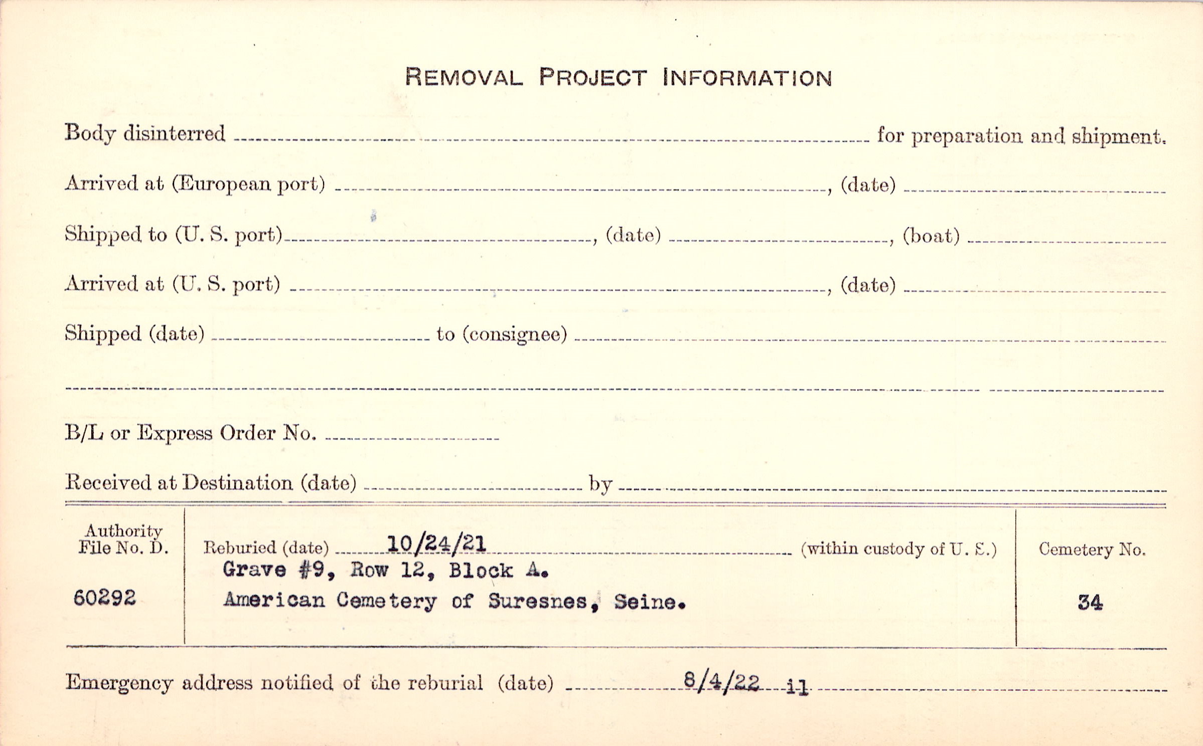 | Permanent Burial in Foreign Cemetery |