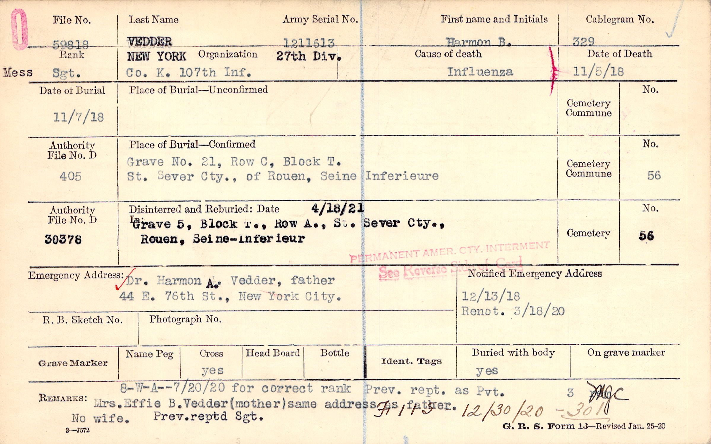 Mrs.Effie B.Vedder(motherà same adress as father., No wife., Prev.reptd Sgt., 8-W-A-- 7/20/20 for correct rank Prev. rept. as Pvt., F115 12/30/20 - 301