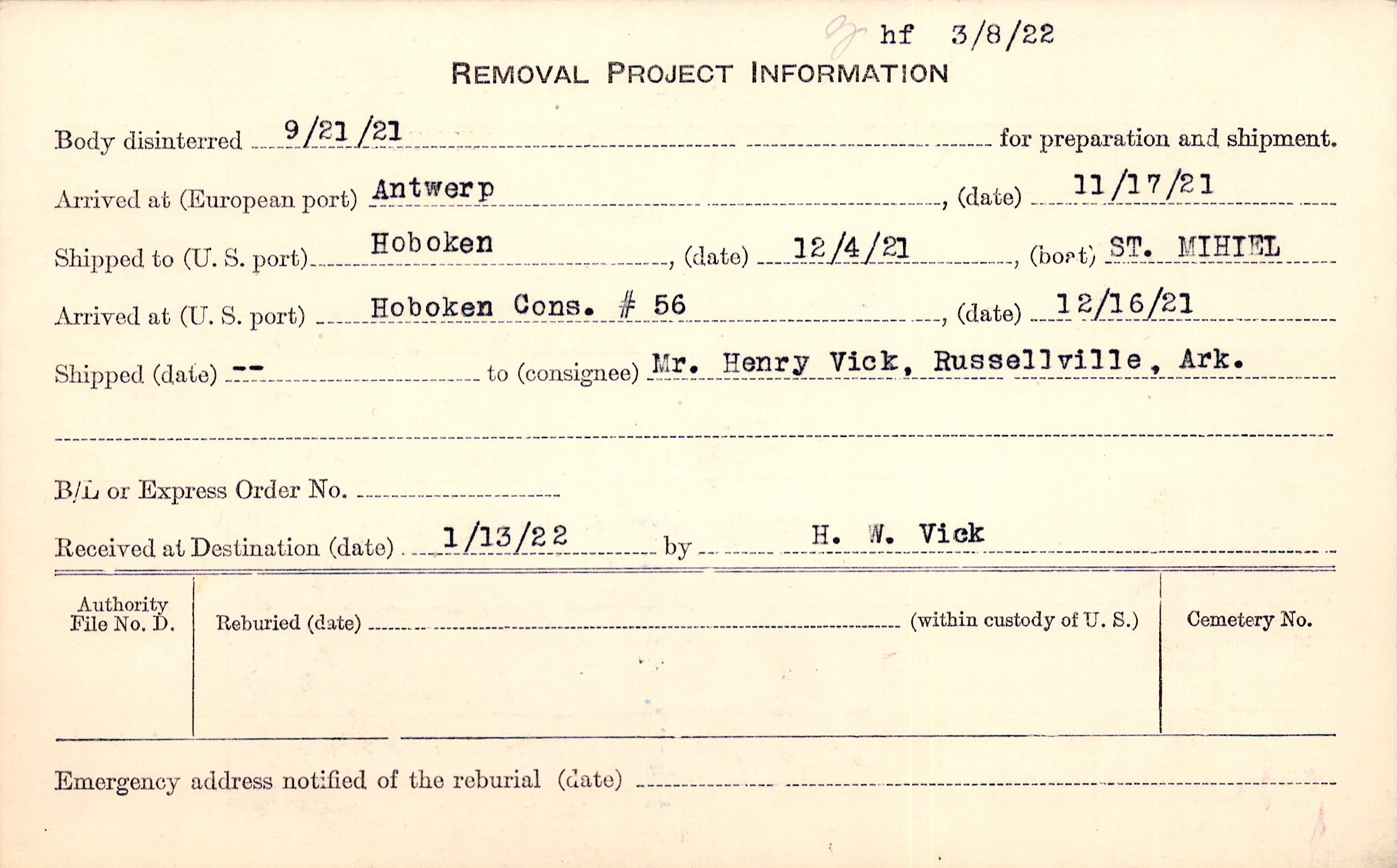 Body disinterred 9/21/1921 for preparation and shipment.