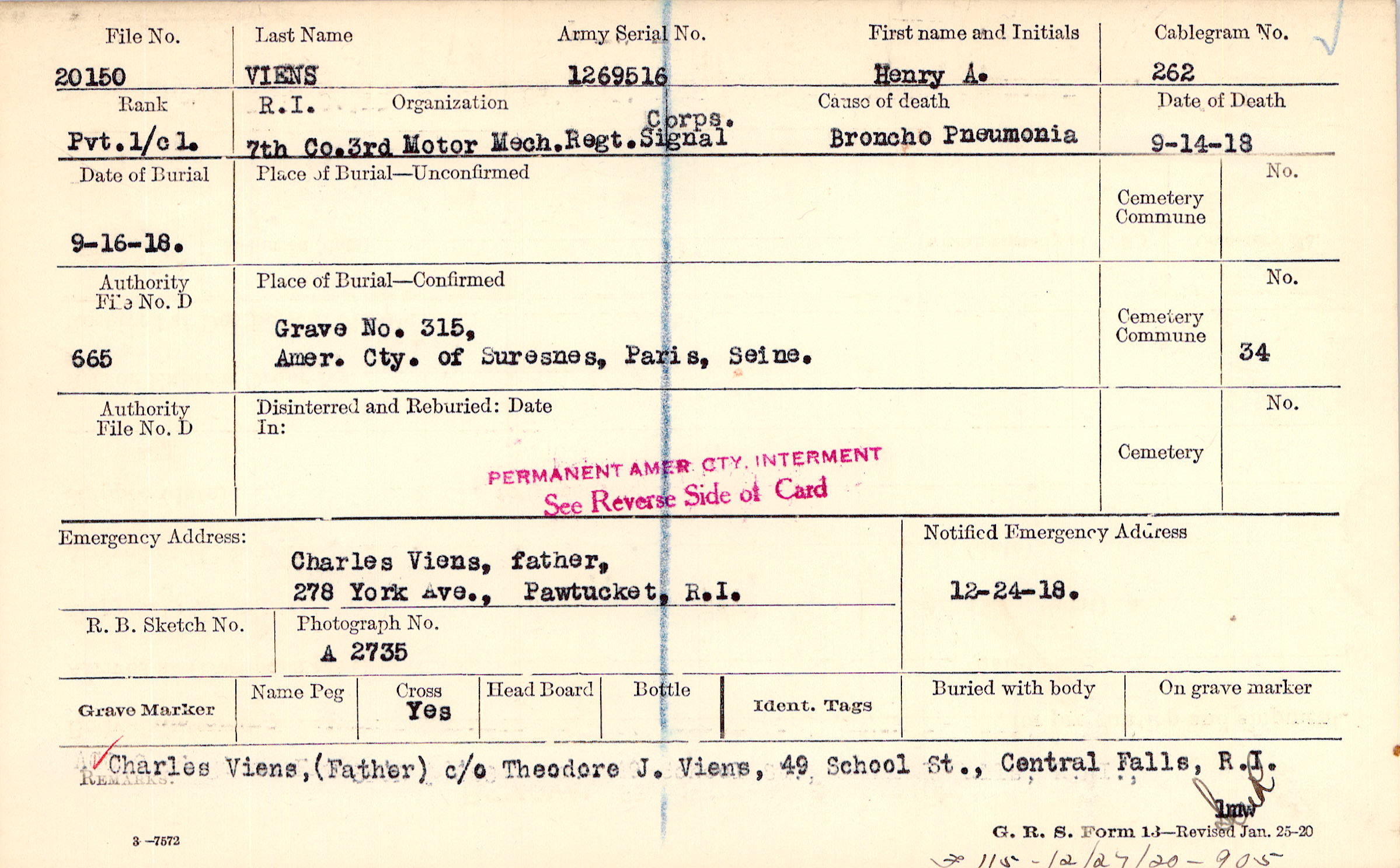 Charles Viens, (Father) c/o Theodore J. Viens, 49 School St., Central Falls, R.I., F115 - 12/27/20 - 905