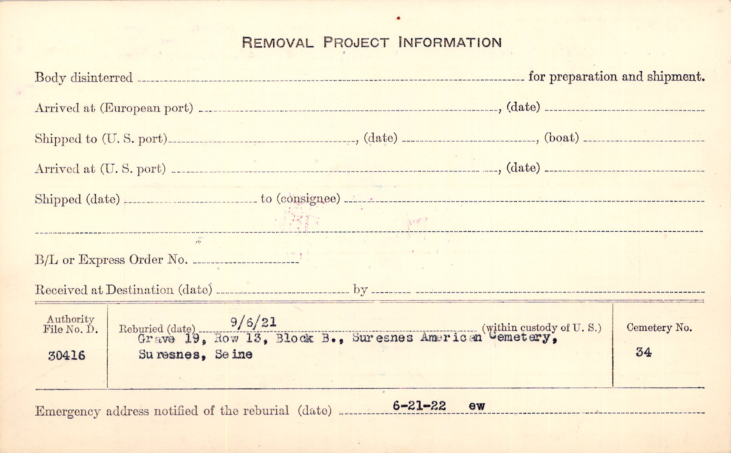 | Permanent Burial in Foreign Cemetery |