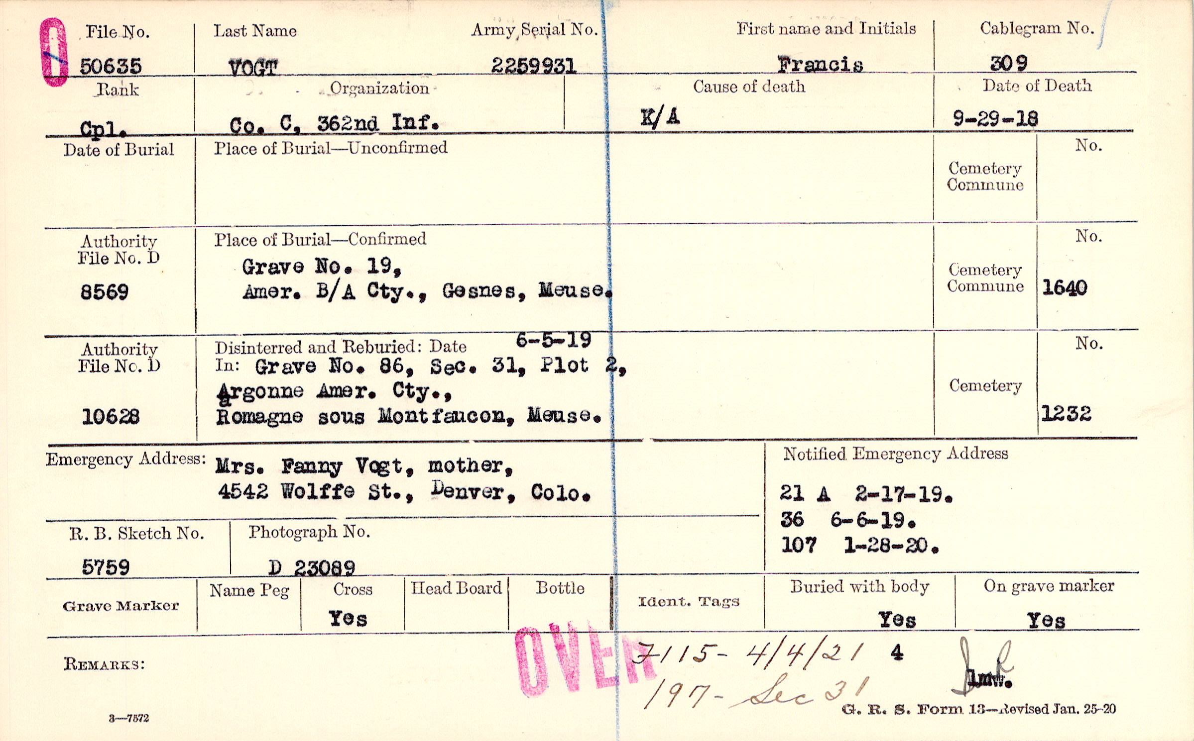 Mrs. Fanny Vogt, mother,, 4542 Wolffe St., Denver, Colo.