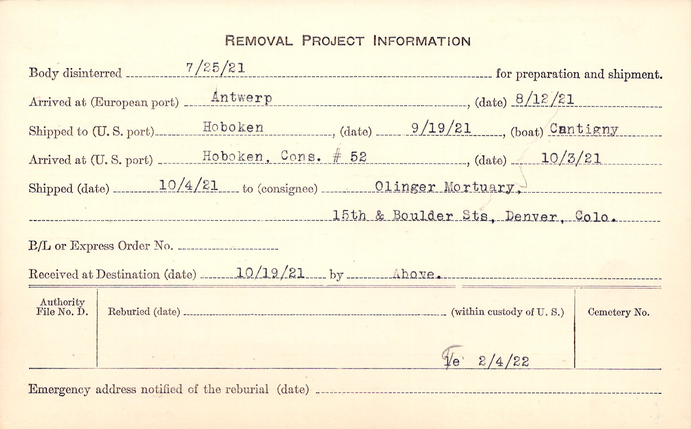 Body disinterred 7/25/1921 for preparation and shipment.