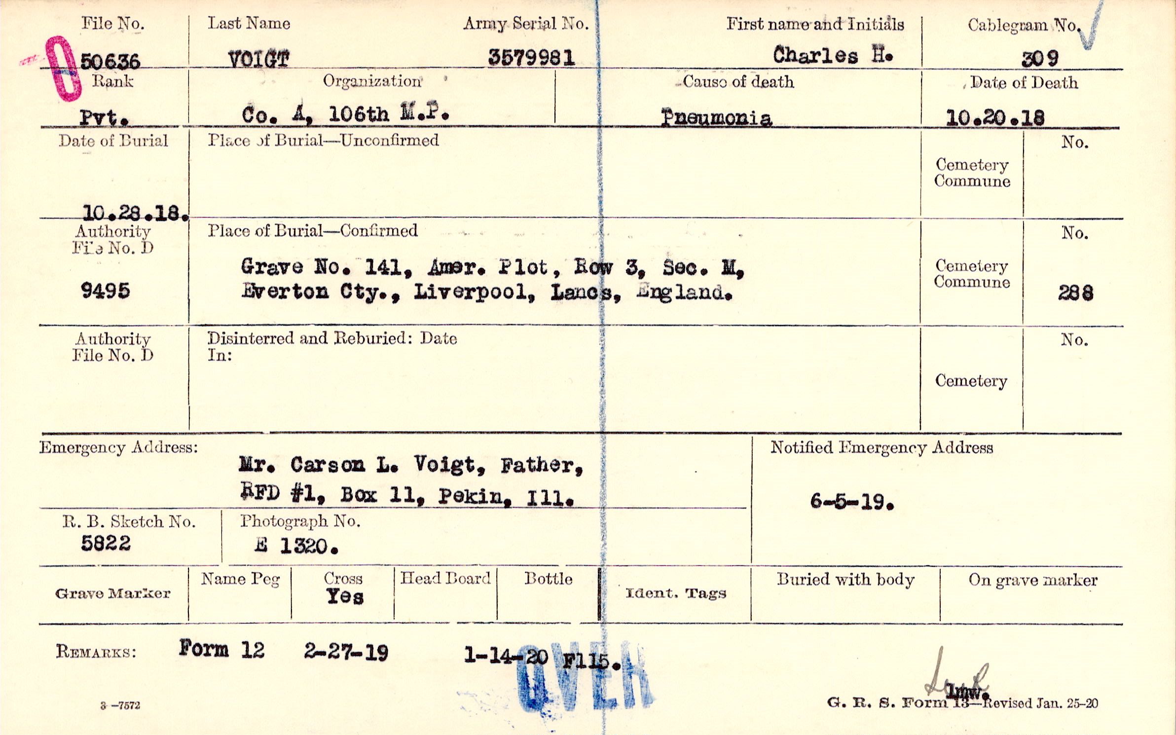 Mr. Carson L. Voigt, Father,, RFD #1, Box 11, Pekin, Ill.