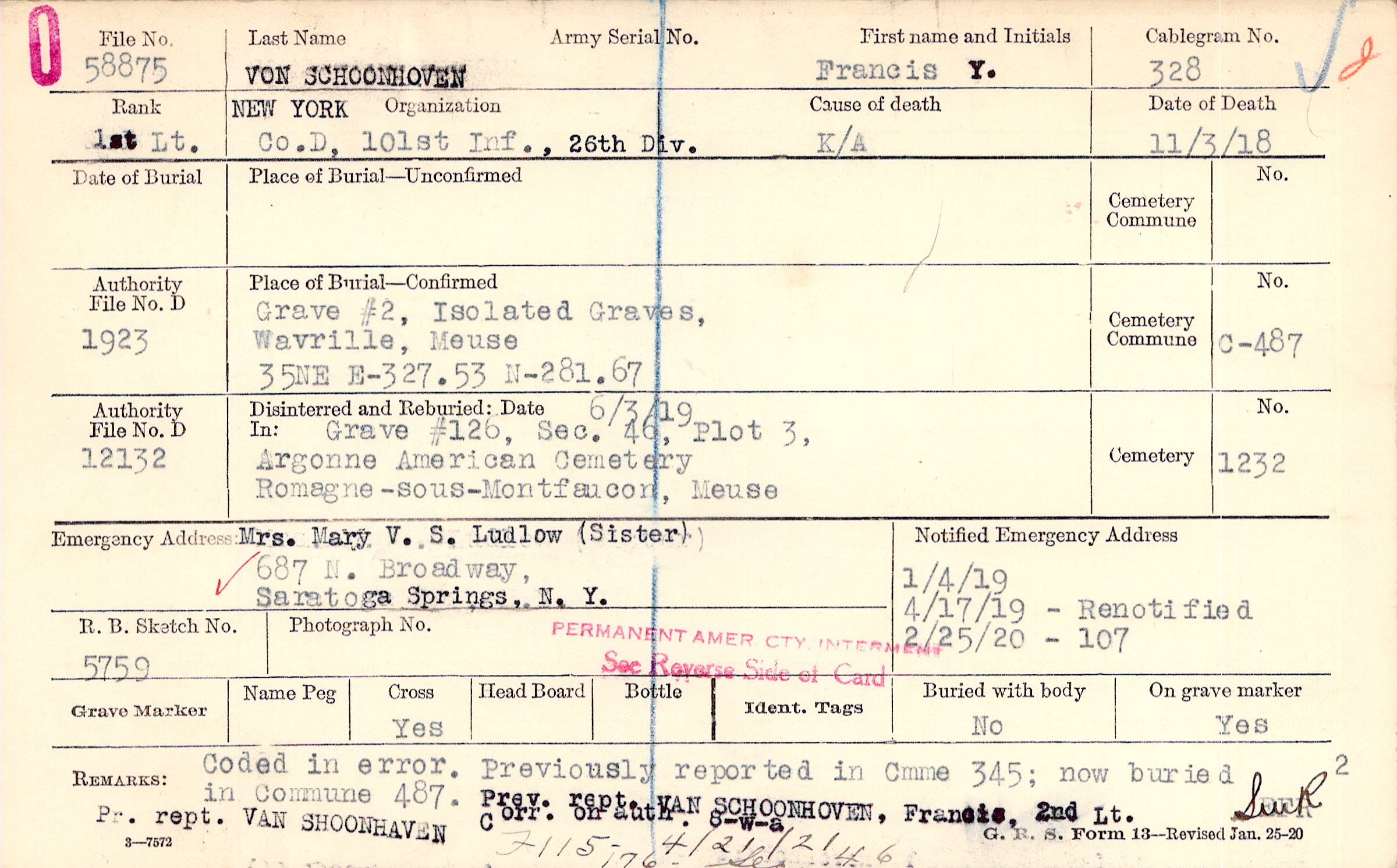 Coded in error. Previously reported in Cmme 345; now buried in Commune 487. Prev. rept. VAN SCHOONHOVEN, Francis 2nd Lt. Pr. rept. VAN SHOONHAVEN, F115 -4/21/21 176 - Sec 46