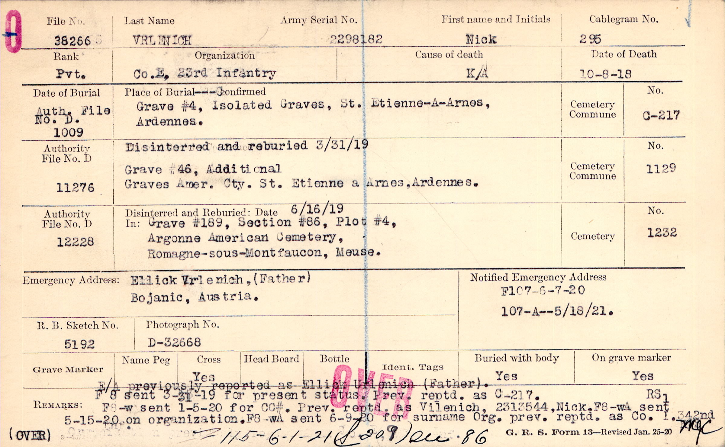 E/A previously reported as Ellick Urlenich (Father) Prev. reptd. as C-217. Prev. reptd. as Vilenich, 2313544, Nick. Org. prev. reptd. as Co. I, 342nd, F 8 sent 3-31-19 for present status. Prev. reptd. as C-217. F8-w sent 1-2-20 for CC#. F8-wA sent 5-15-20 on organisation. F8-wA sent 6-9-20 for surname, F115 - 6-1-21 (S-209) sec 86