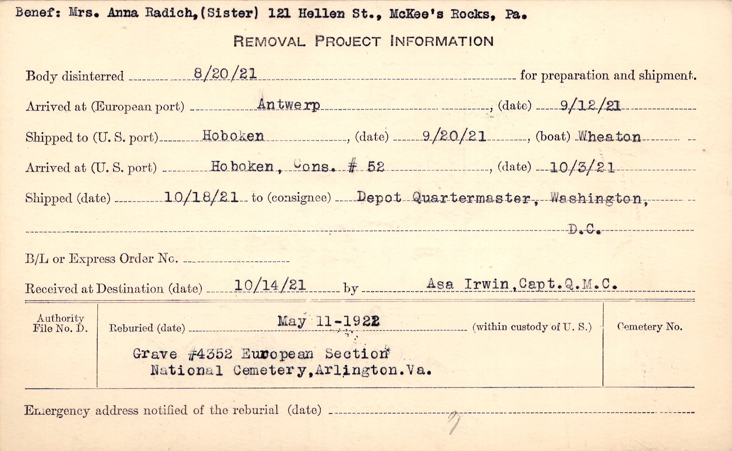 Benef: Mrs. Anna Radich, (Sister) 121 Hellen St. McKee's Rocks, Pa. |