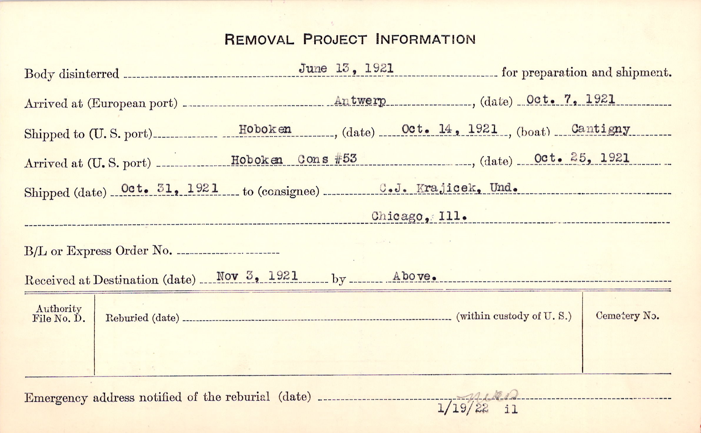 Body disinterred 6/13/1921 for preparation and shipment.