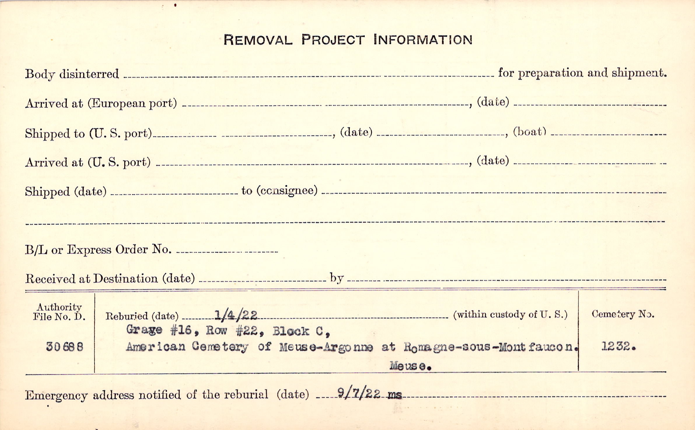 DD prev. reptd. as 10-23-18 Rank as Cpl. Correct by AGO letter 5-18-20. Mr. Frederick P. Vunck, Brother (Benef.) 51 Baldwin Ave., Milford, Conn., F 115 - 3/28/21 191 - sec 21