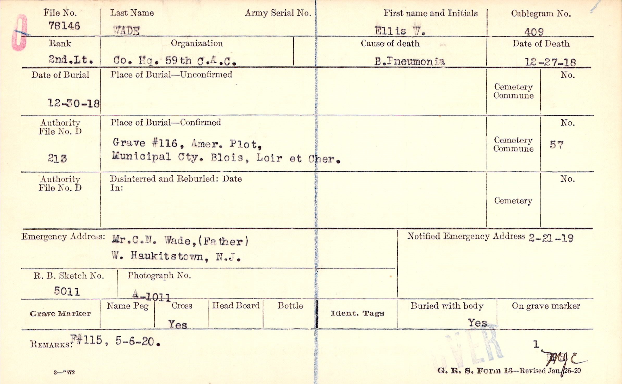 Grave #116, Amer. Plot, Municipal Cty., Blois, Loir et Cher.