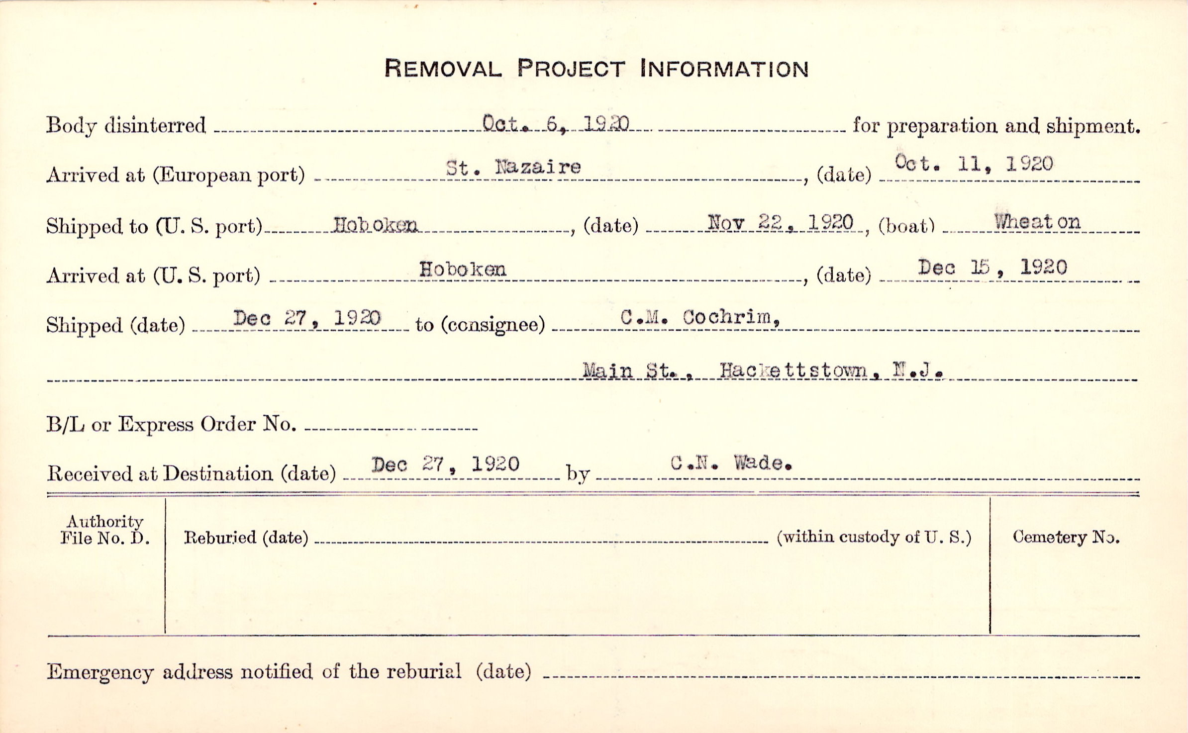 Body disinterred 10/6/1920 for preparation and shipment.