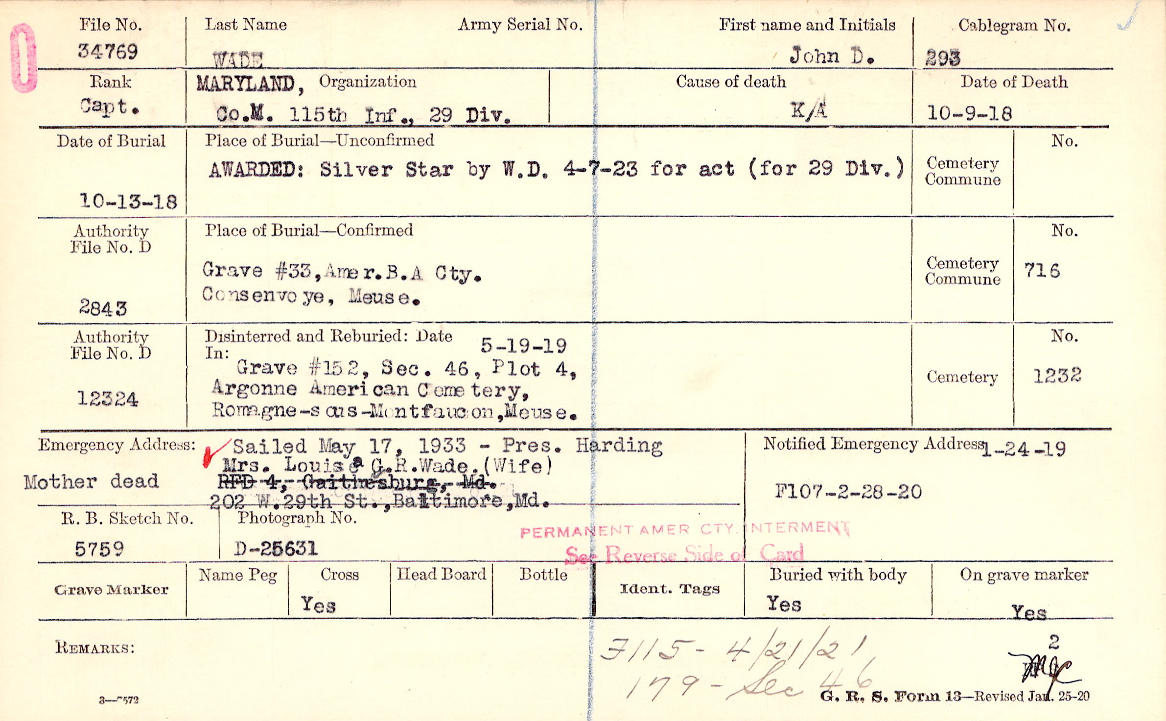 Mrs. Louisa G.R. Wade (Wife), 202 W.29th St., Baltimore, Md., Mother dead Sailed May 17, 1933 - Pres. Harding