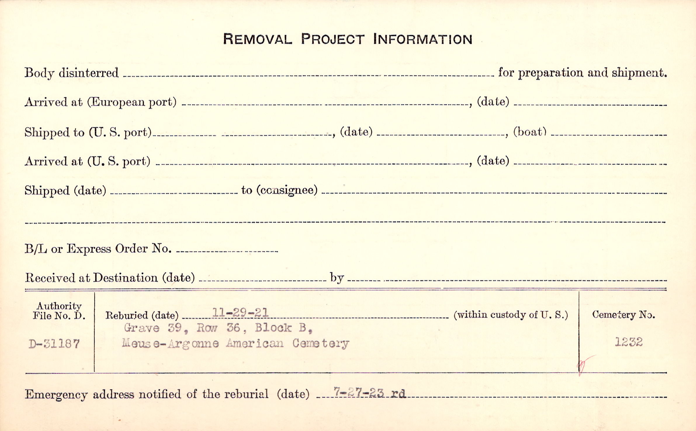 | Permanent Burial in Foreign Cemetery |