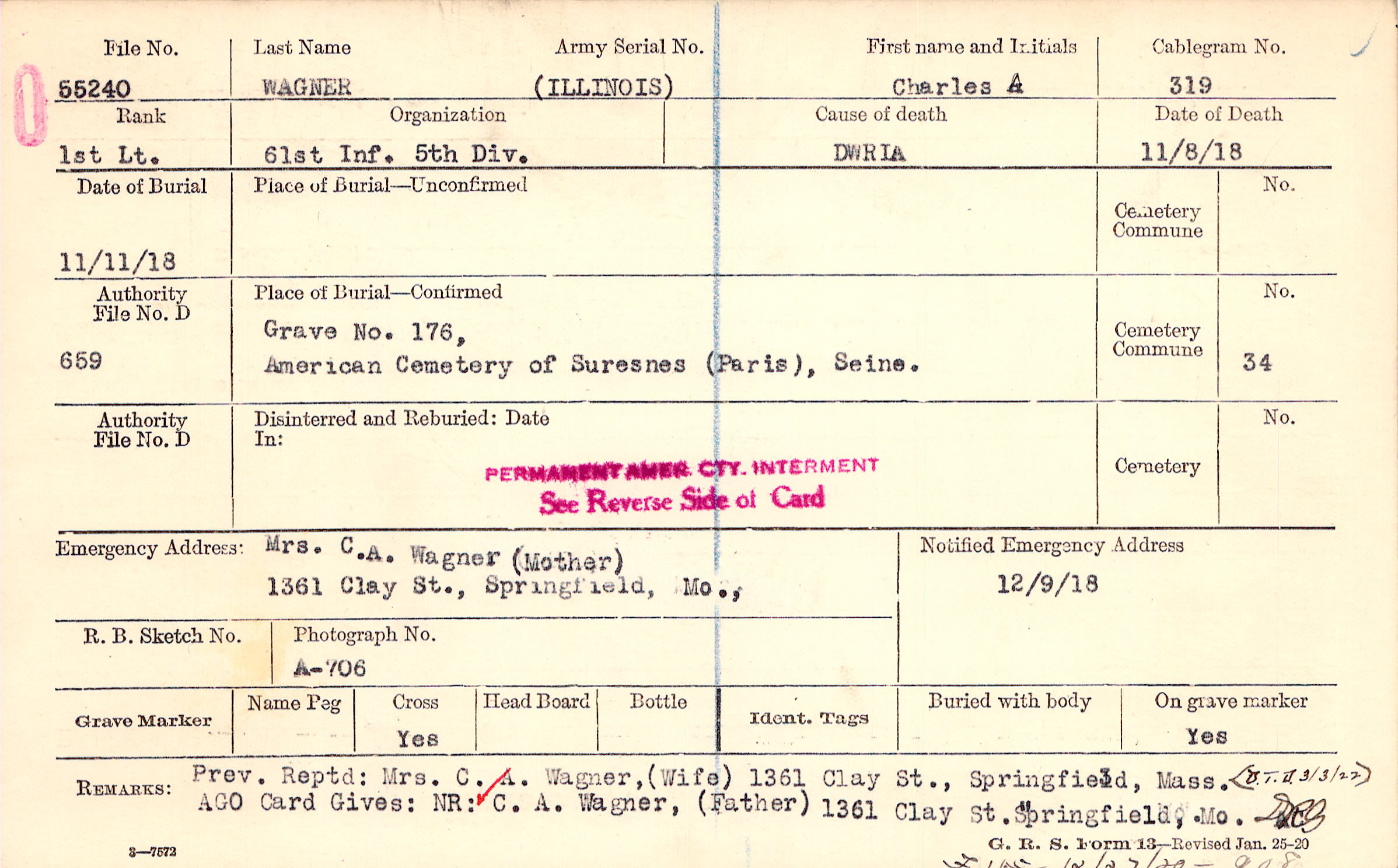 Prev. Reptd: Mrs. C. A. Wagner, (Wife), 1361 Clay St., Springfield, Mass., (D.T.S 3/3/22) AGO Card Gives: NR: C.A. Wagner, (Father), 1361 Clay St., Springfiled, Mo., F115 - 12/27/20 - 948