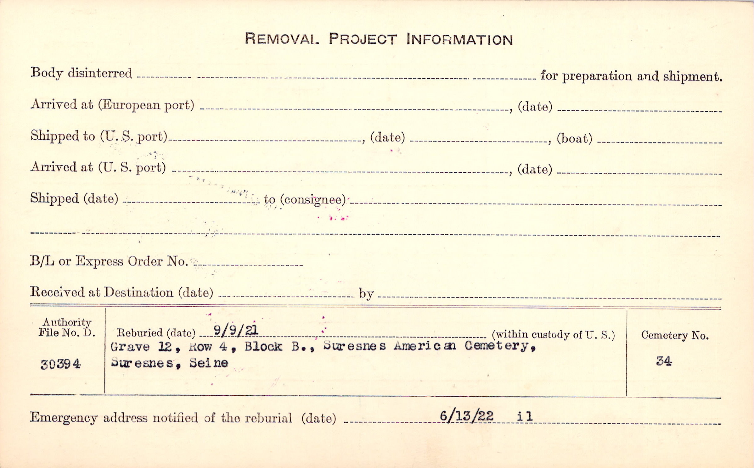 Grave 176, American Cemetery of Suresnes (Paris), Seine.