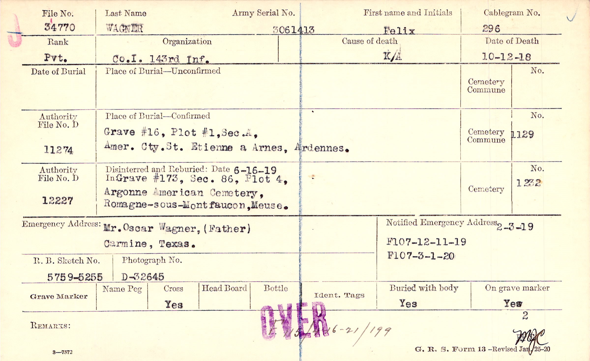 Grave 173, Section 86, Plot 4, Argonne American Cemetery, Romagne-sous-Montfaucon, Meuse