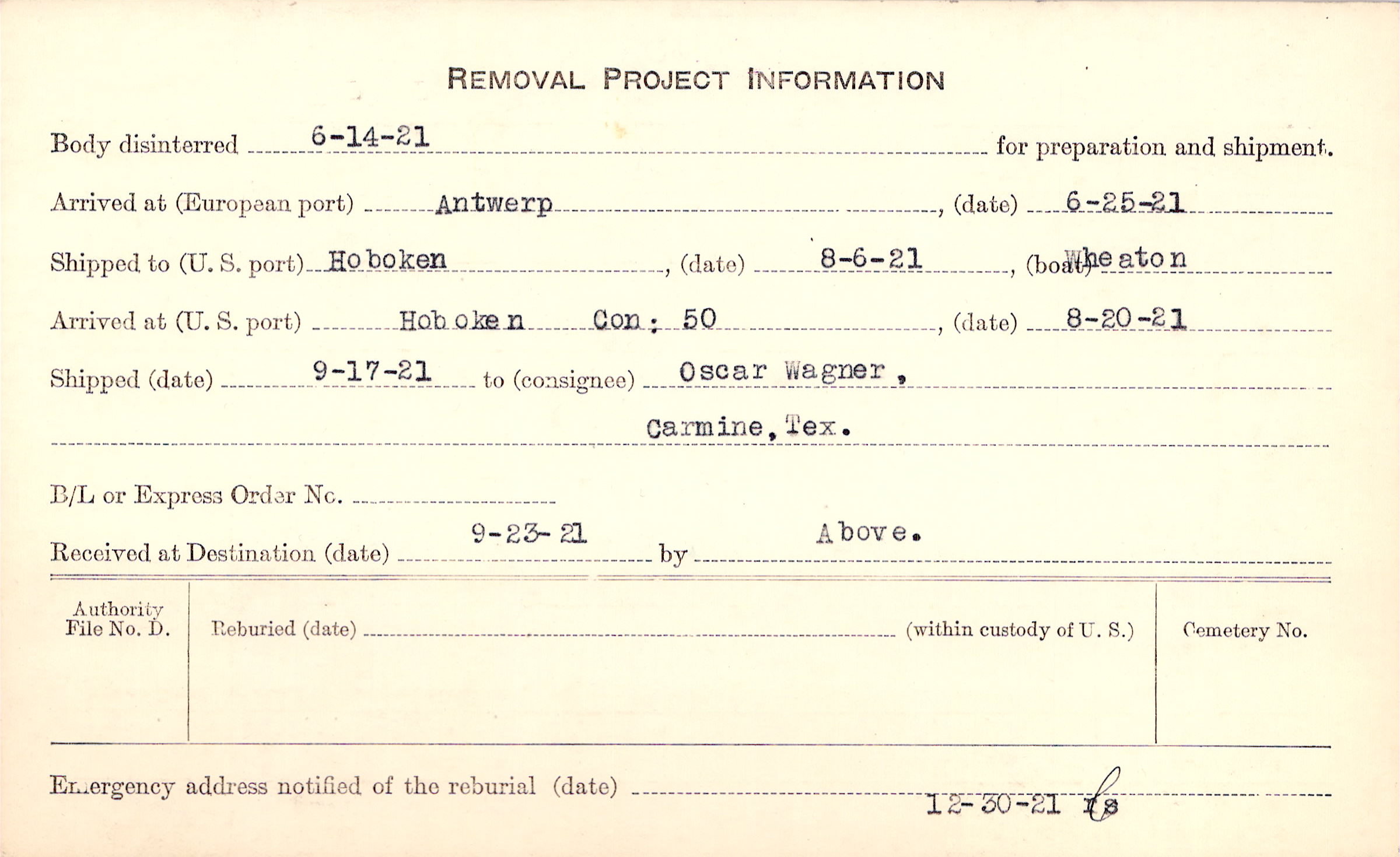 Body disinterred 6/14/1921 for preparation and shipment.