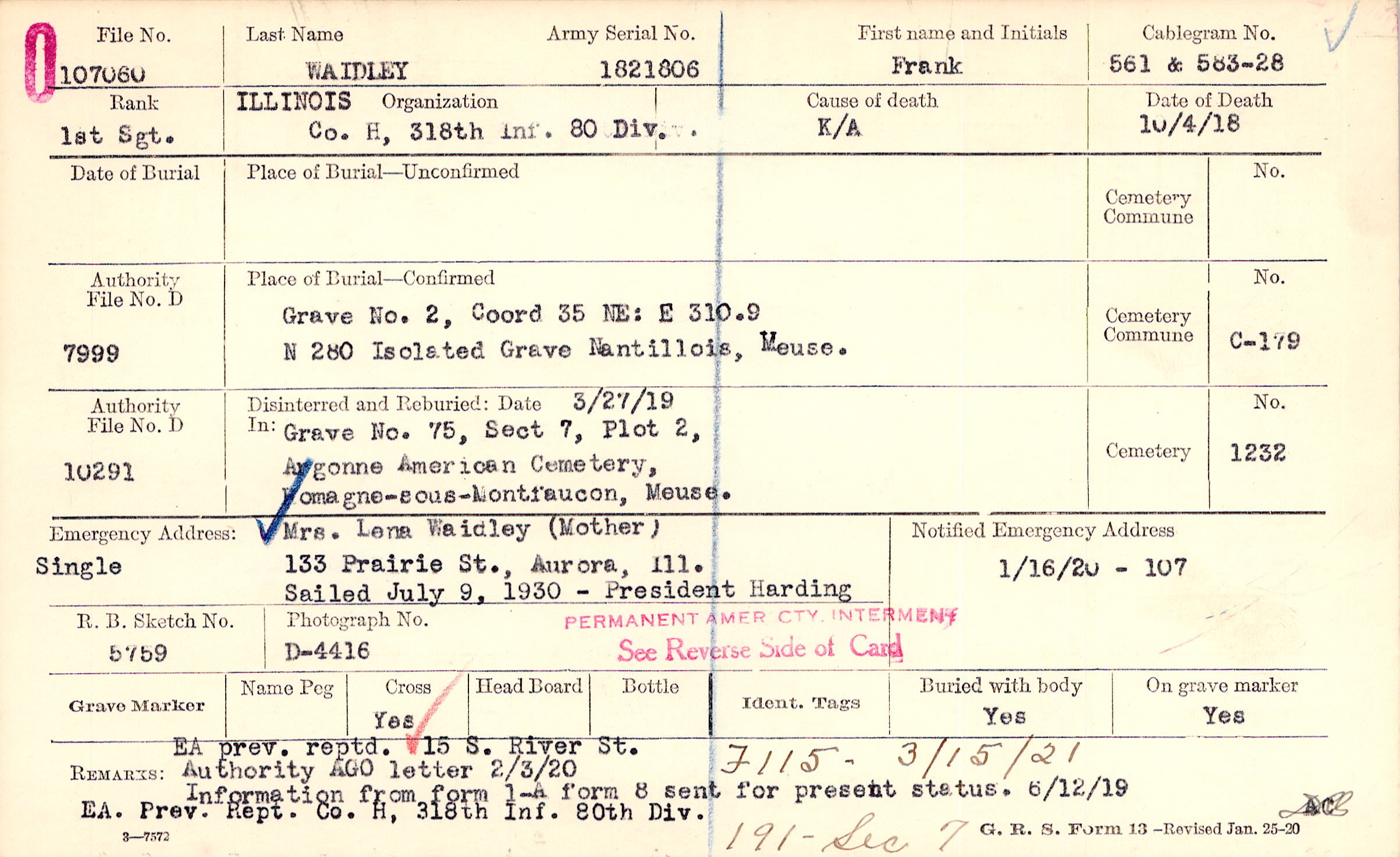 EA prev. reptd. 15 S. River St. Authority AGO letter 2/3/20 EA. Prev. Rept. Co. H, 318th Inf. 80th Div., form 8 sent for present status, 6/12/19, F115 3/15/21, 191, Sec 7