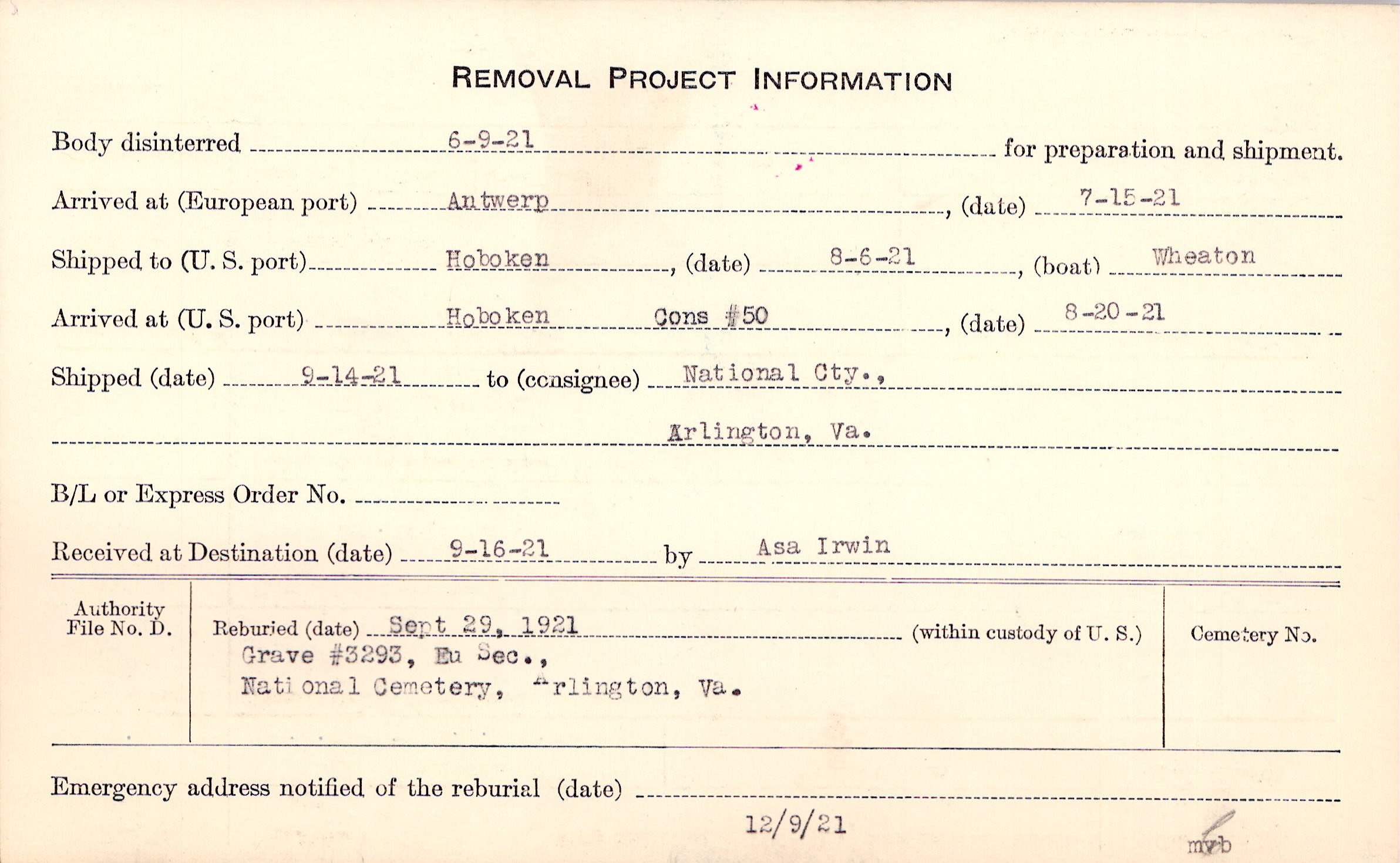 Body disinterred 6/9/1921 for preparation and shipment.