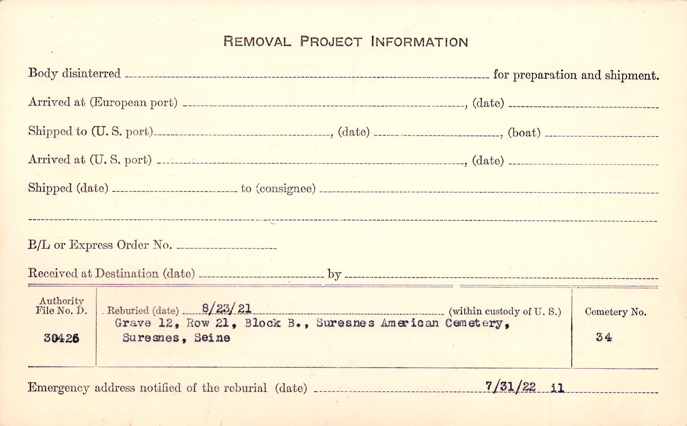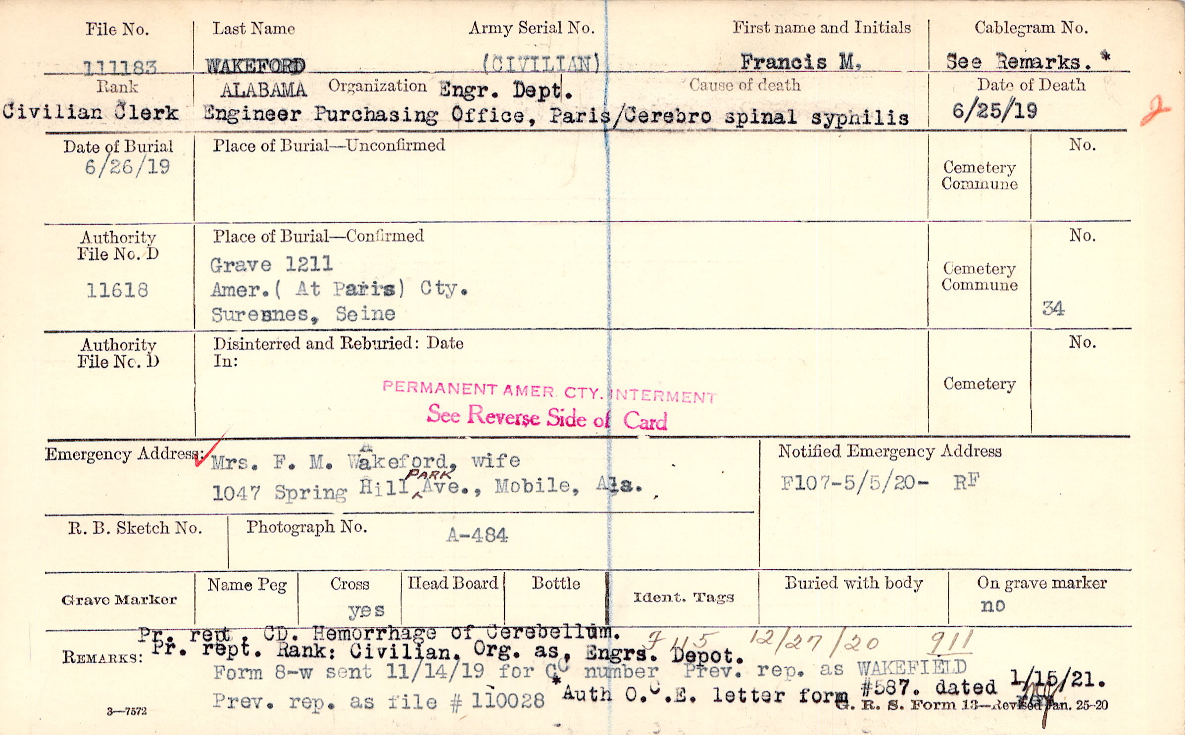 Grave 1211, Amer. at Paris Cty., Suresnes, Seine.