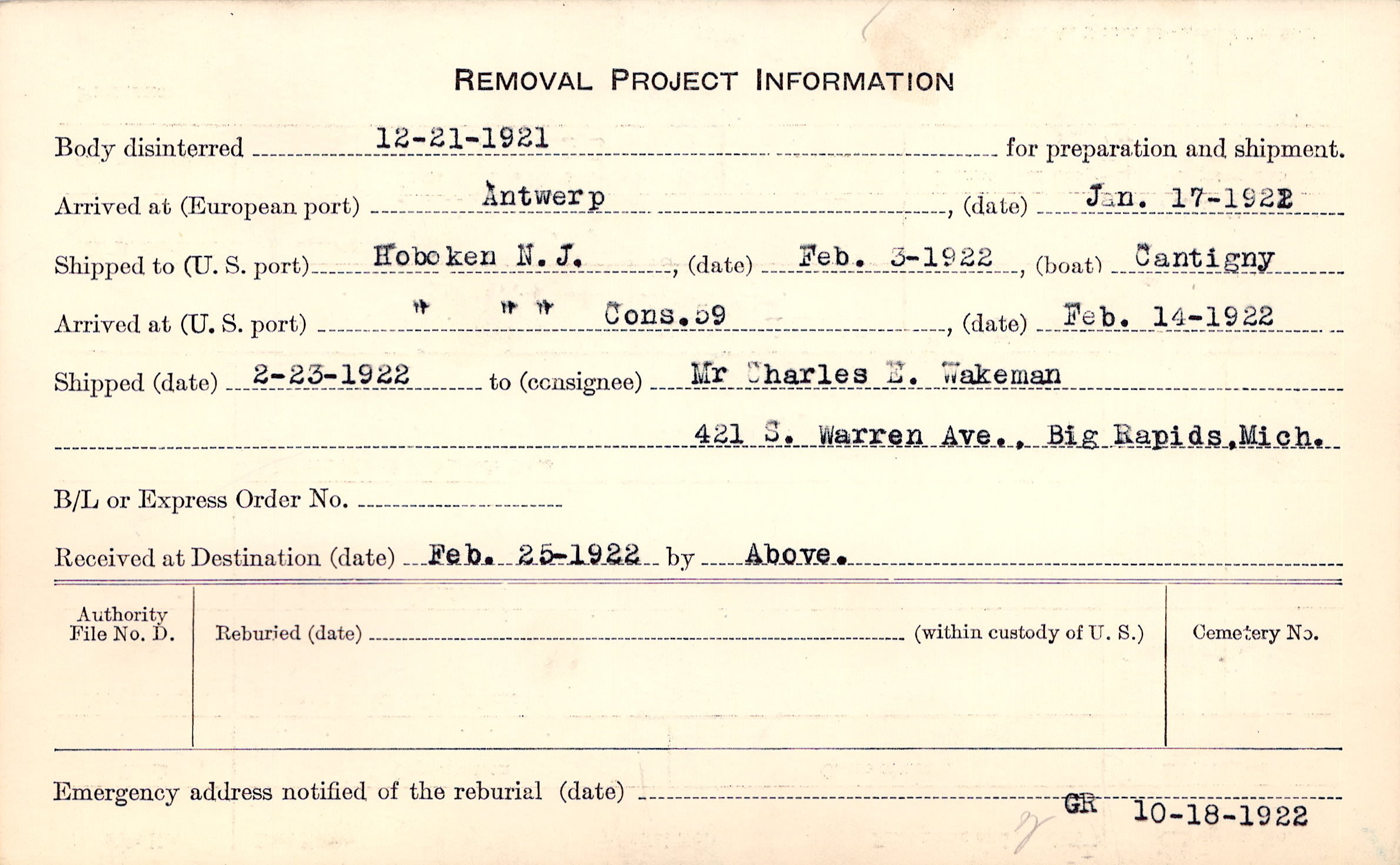 Mr. Charles E. Wakeman (Father), 421 S. Warren St., Big Rapids, Mich.