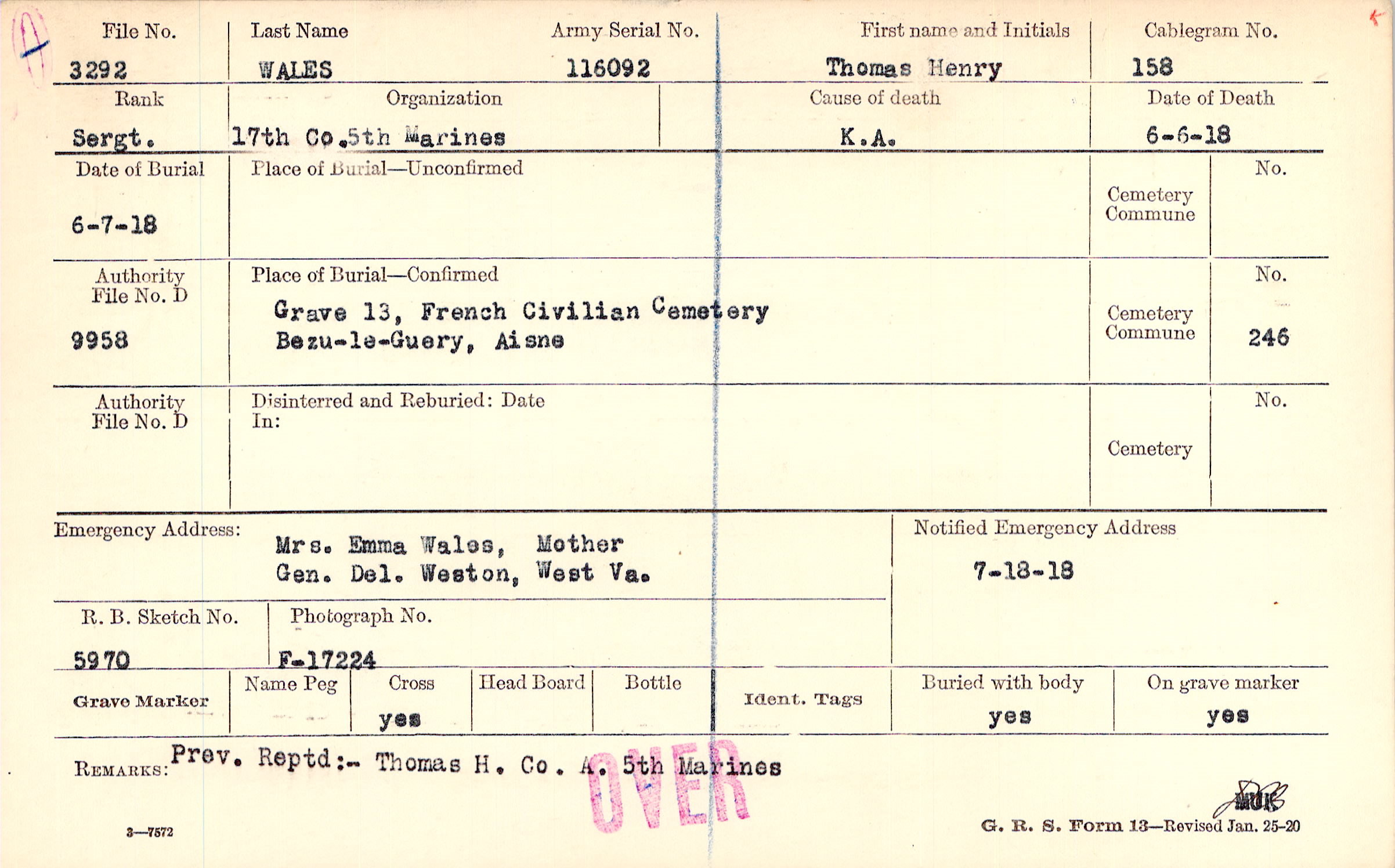 Prev. Reptd:- Thomas H. Co. A. 5th Marines