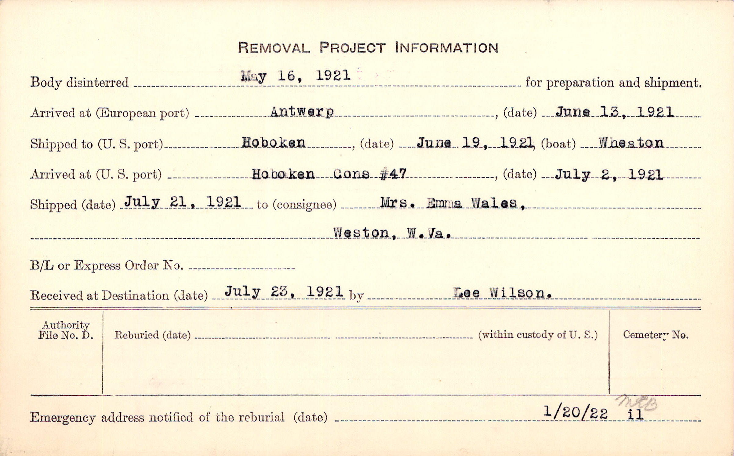 Body disinterred 5/16/1921 for preparation and shipment.