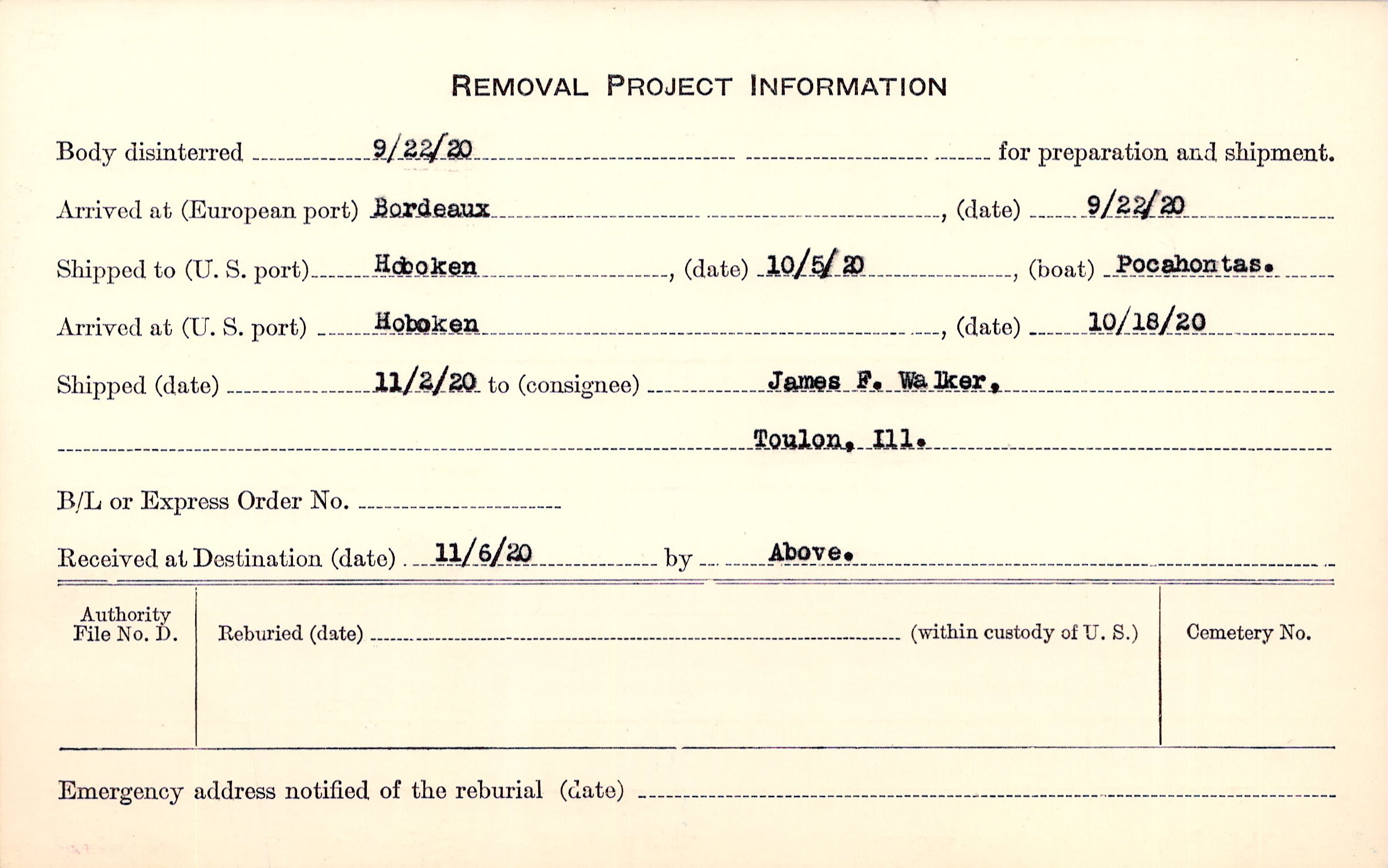 Body disinterred 9/22/1920 for preparation and shipment.