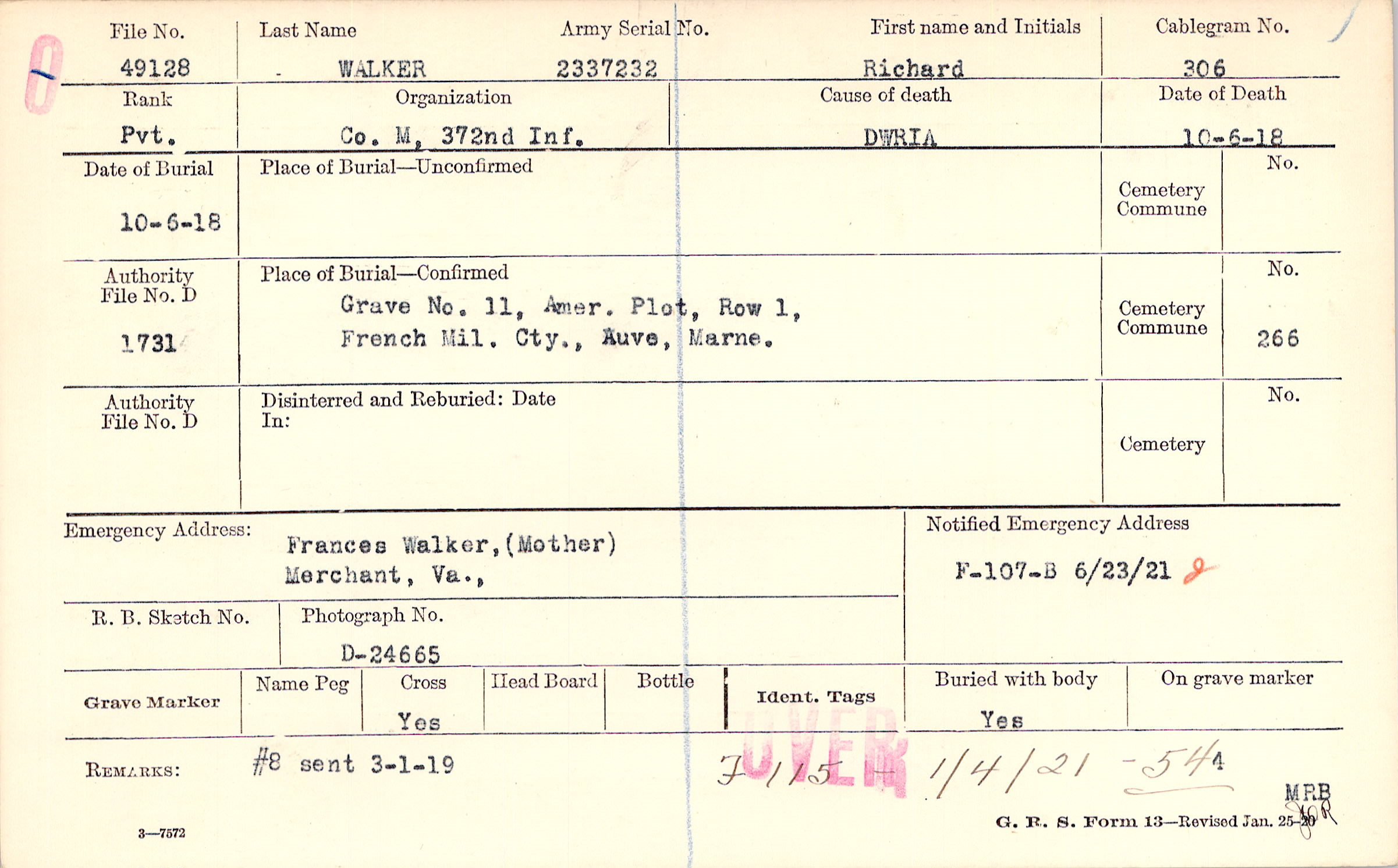Grave 11, Amer. Plot, Row 1, French Mil. Cty., Auve, Marne.