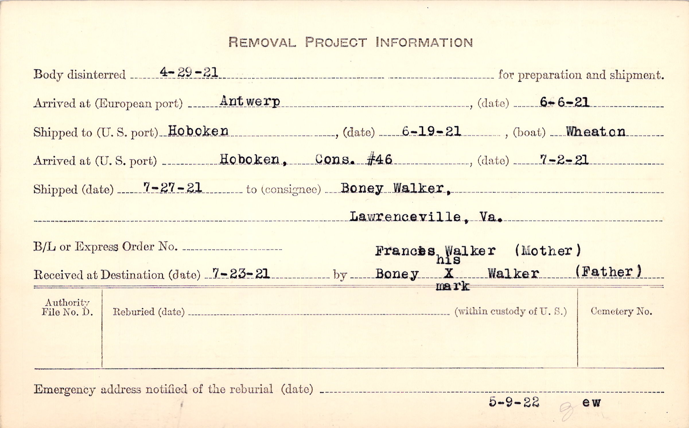 by Frances Walker (Mother), Boney (his X mark) Walker (Father)